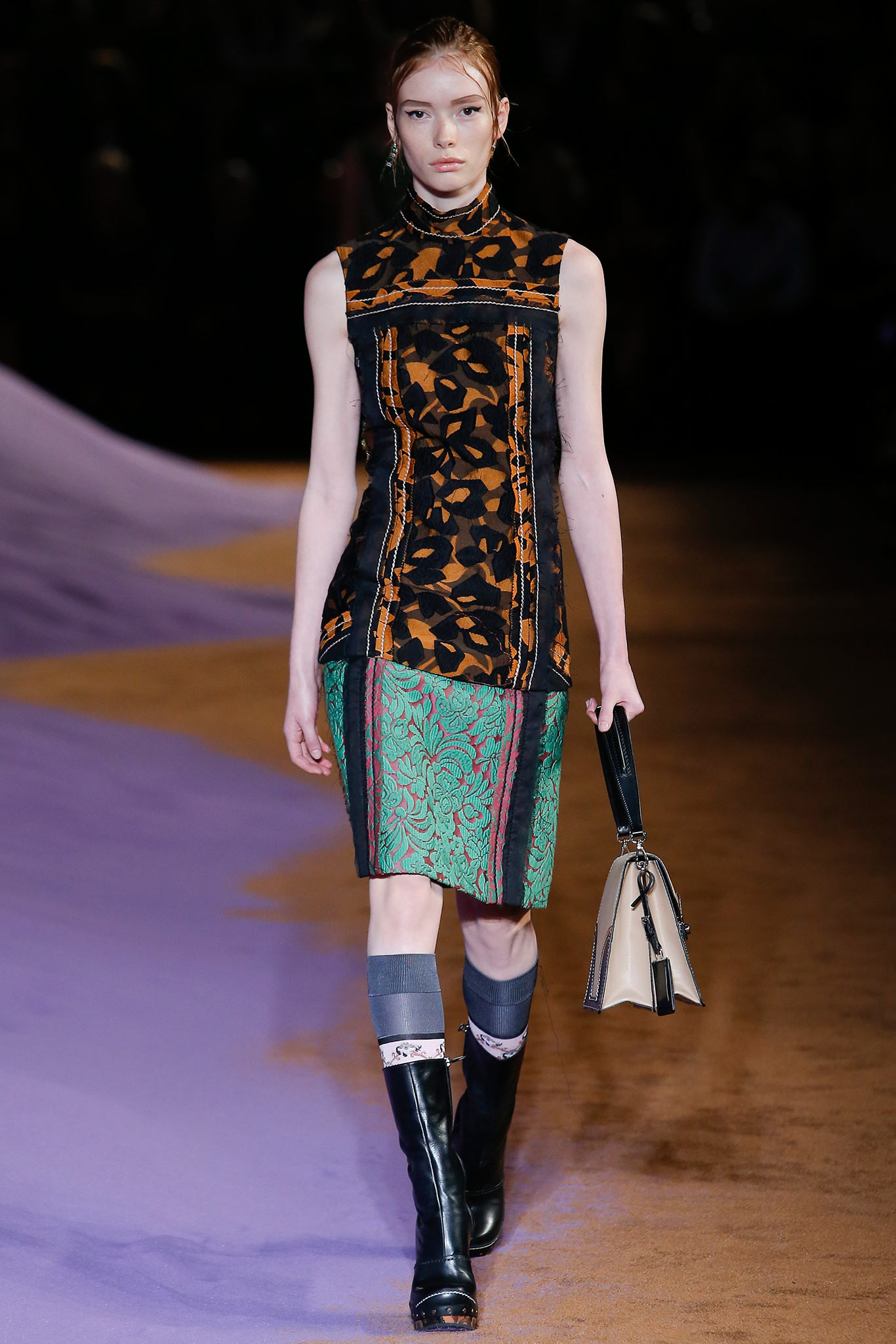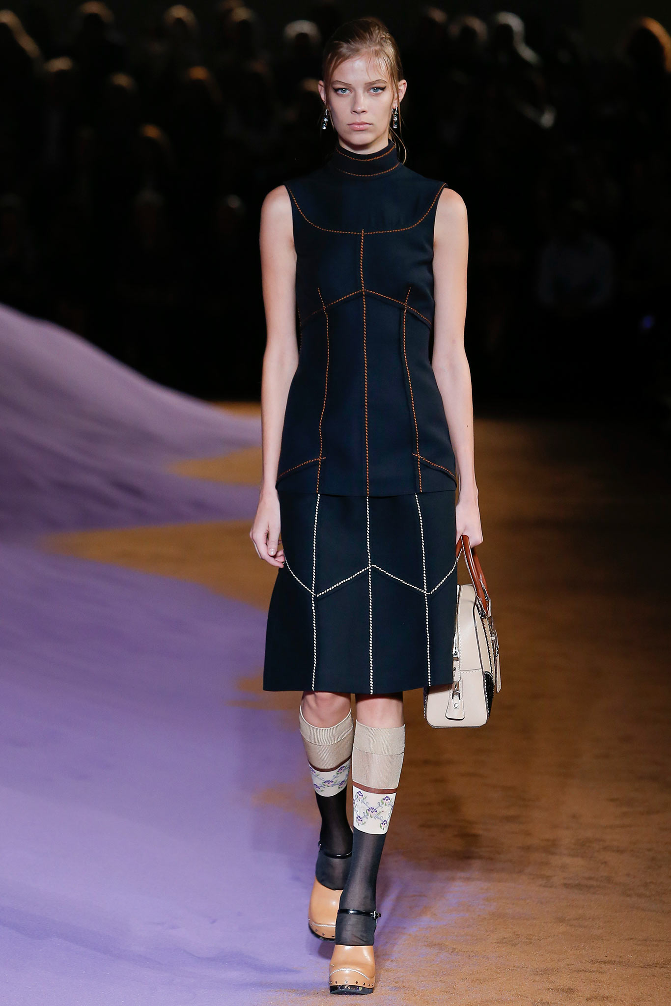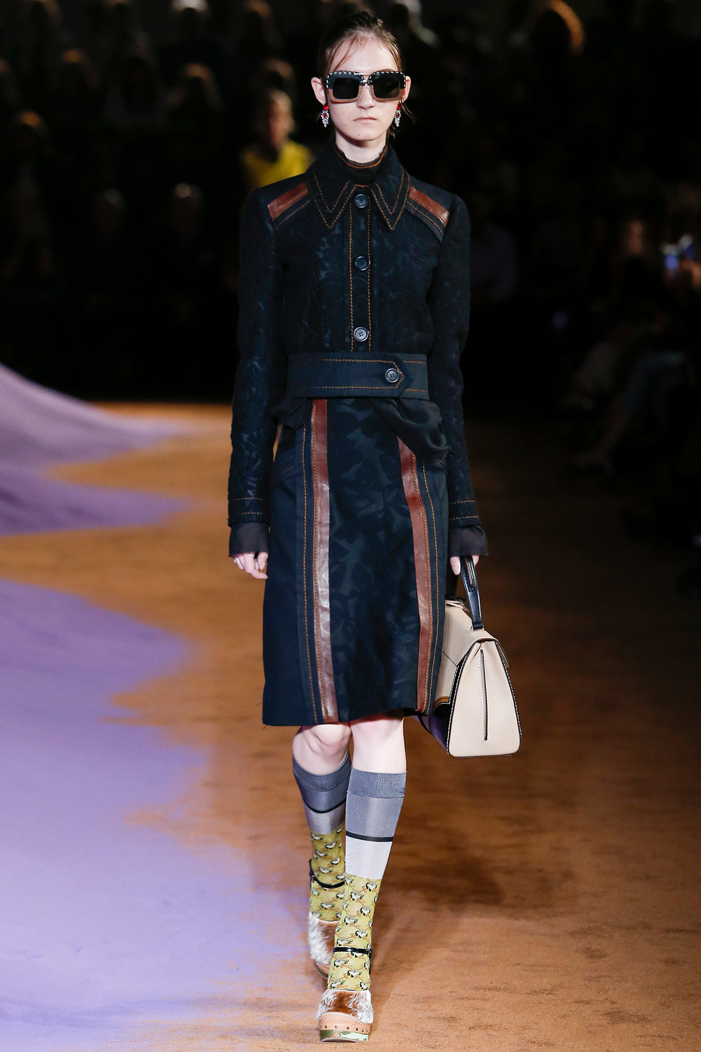 衣服本身同樣讓人讚嘆不已。雖然看起來的整體輪廓是一貫的Prada美學–及膝外套,七分袖,長襪,但是這一次是古典與現代的交鋒。