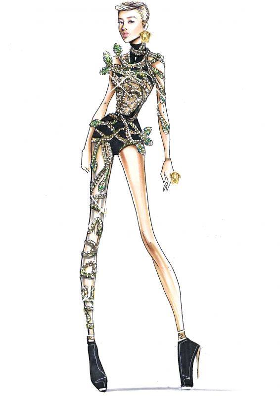 在即將推出的新專輯中,為了一首和Versace經典商標Medusa同名的歌曲,也商請了Versace幫她訂製了一套專屬打歌服。這套衣服說起來成品並沒有讓我驚艷,可能是因為設計原稿上的設計比較難用各式亮片和水晶表現出現條的柔順,所以感覺卡卡。另外,那個多出來的褲管我也覺得有點唐突(但可能是為了要凸顯 Medusa所以不得不的設計),另外就是鞋子,總覺得有更好的選擇。我是覺得這套衣服如果是給Queen B穿起來應該會更加合適。