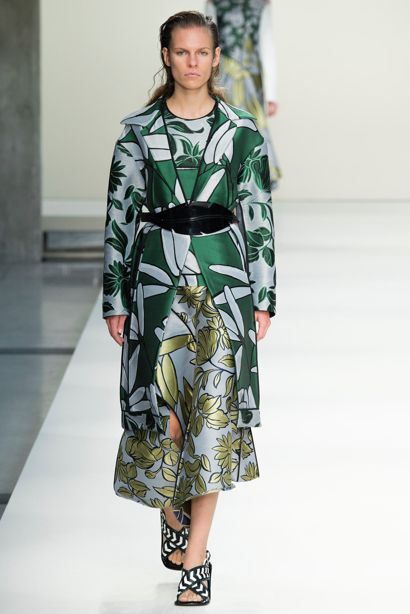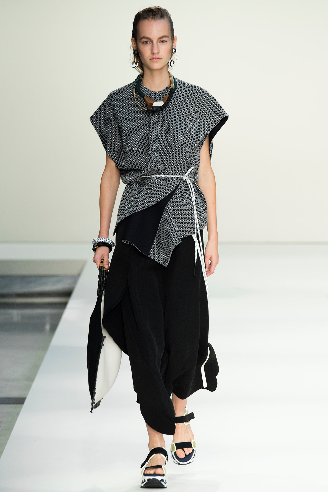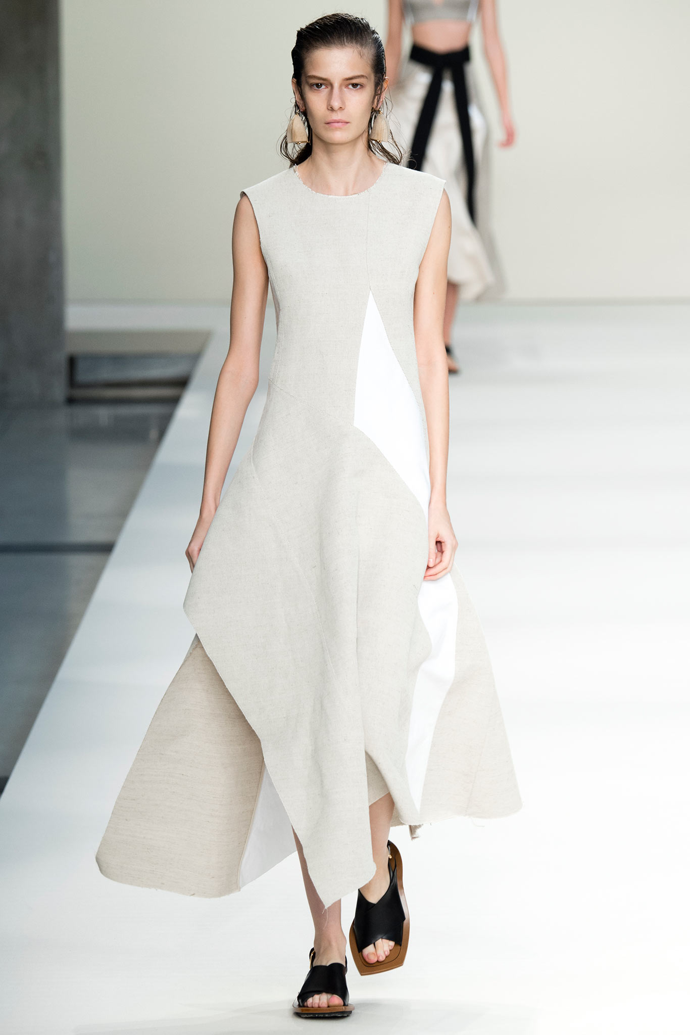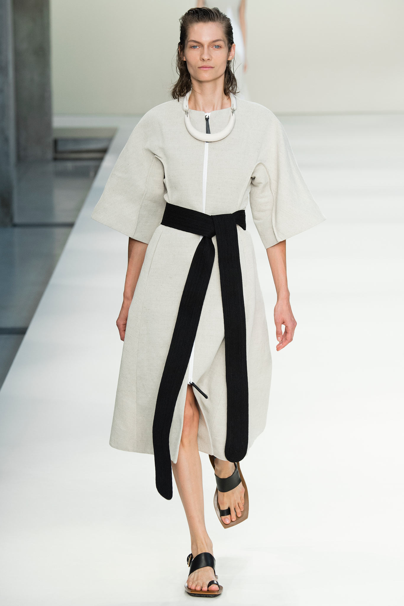 這一季的Marni前幾套以質樸的寬袖麻料洋裝配上黑色長腰帶,完全就是仙風道骨路線。但是我們看到脖子上的項鍊,又有點前衛,卻帶來了閑靜感。