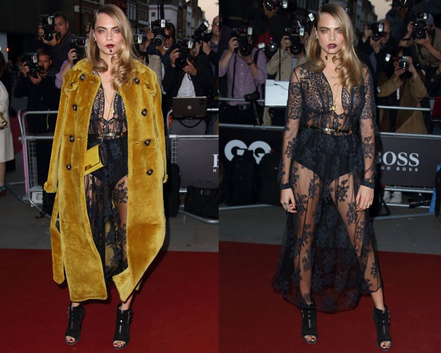 Cara Delevingne一點都不意外地是以Burberry Prorsum示人。這套蕾絲禮服是很性感沒有錯啦,但我對於她內搭的黃埔大內褲有點感冒,感覺就是硬生生多了一大塊。然後對於她嘴巴咬一根別針我也不覺得有任何性感意味,反而覺得很多餘。小明星才要用一堆雜七雜八的花招來搶版面,妳Cara怎麼還需要咧?怪怪…