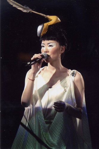 說到shoe hat,就不能不說王菲在2003年「菲比尋常」演唱會中開場那驚天地泣鬼神的高跟鞋接羽毛的帽子了。我想靈感應該也是來自於Schiaparelli的經典設計為主軸再做修改和延伸吧!