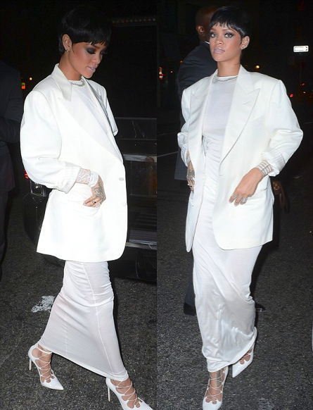 【Fashion Icon】Rihanna在CFDA的after-party倒是乖乖地穿上了衣服,還穿了不少。這一整套Tom Ford理論上應該只有裡面那件連身白緞面洋裝。但是在搭上了一點點oversized的男版外套之後,瞬間把整體的感覺變得很中性,很帥氣,然後腳上那高跟鞋又很性感。只能說她好厲害,怎樣都游刃有餘。