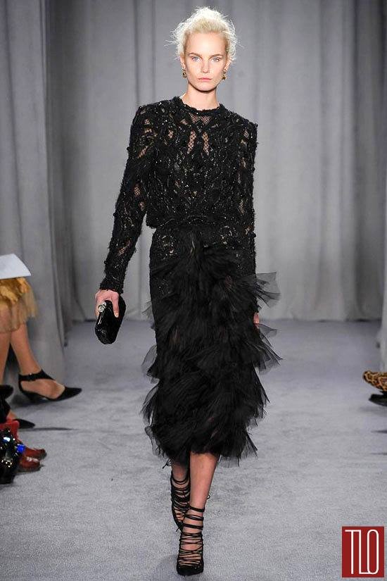 這一件2014 秋冬的Marchesa的禮服我很喜歡,上半身由細緻的蕾絲編織而成,然後有一點點的網狀透視,透出一點性感。而裙子的層狀堆疊,非但沒有重量感,反而在動態上非常順暢也相當輕巧。
