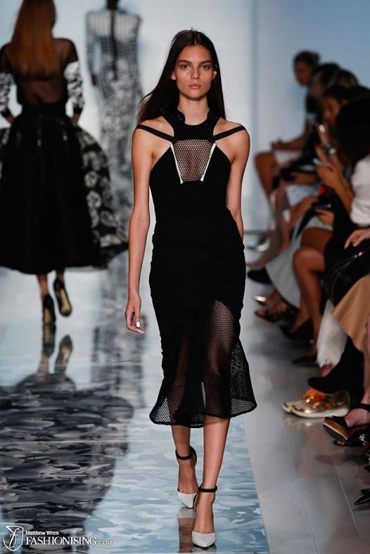 這一件黑色洋裝其實在結構上有點複雜。上半身在長輩的地方和下半身的裙擺部分是以網狀結構表達性感,整件洋裝其實蠻前衛的,唯一我不太懂的地方就是在那個「肩帶」。放在那邊我覺得有點多餘,但是如果拿掉又好像覺得少了一點點什麼,可是在秀上我又不覺得這肩帶的存在有不妥之處,真奇妙。