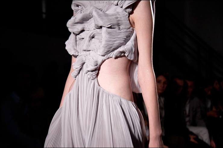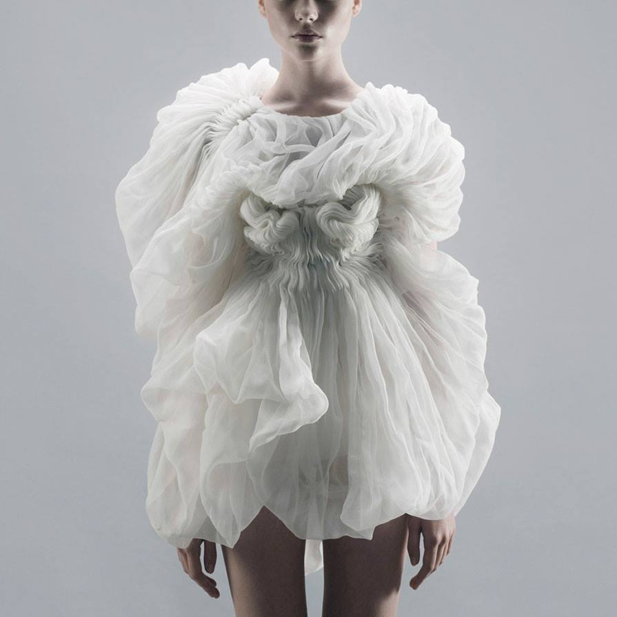 再來仔細看看她的設計,她的衣服裡面充斥著大量著縐折,線條乍看起來好像雜亂但事實上卻像是偉大建築中的雕樑畫棟一般計算縝密的計算。剪裁上相當流暢,充斥濃郁東方氣息卻又巧妙地融合了西方大膽的元素,把女性的身體經由布料做出不同於以往的詮釋。看到她的作品,你內心會有很多悸動,因為她的作品有Iris van Herpen和Alexander McQueen的大膽與前衛創意但在細節上又有濃郁的東方風味。這樣的功力絕對可以說是一個鬼才級的人物。