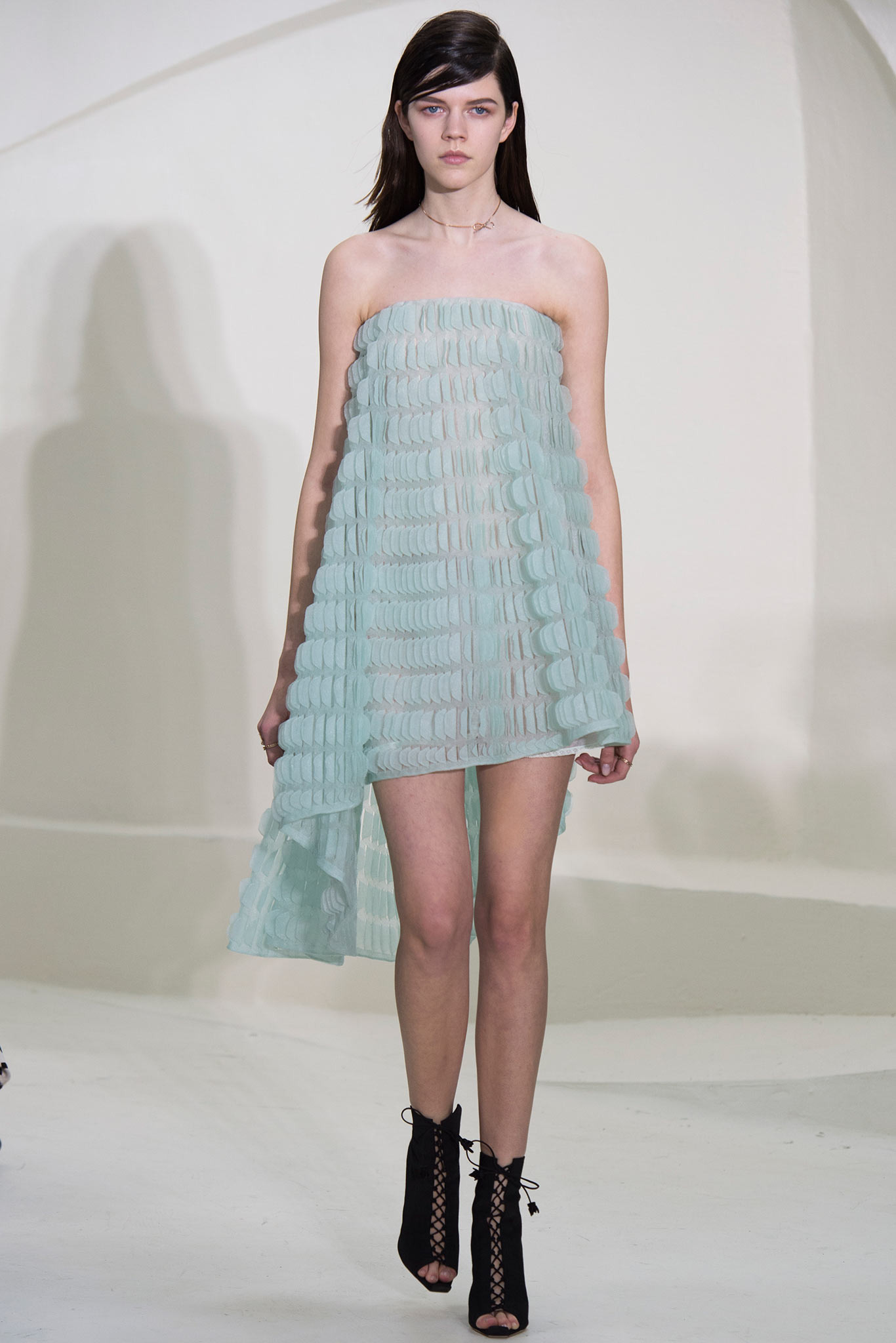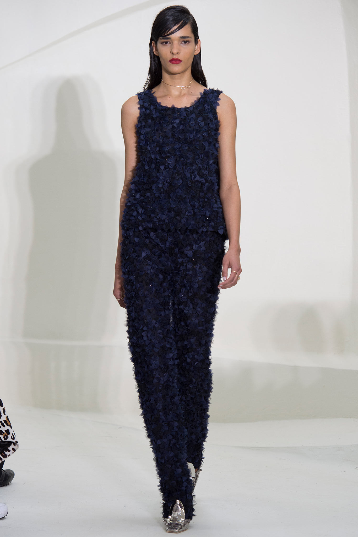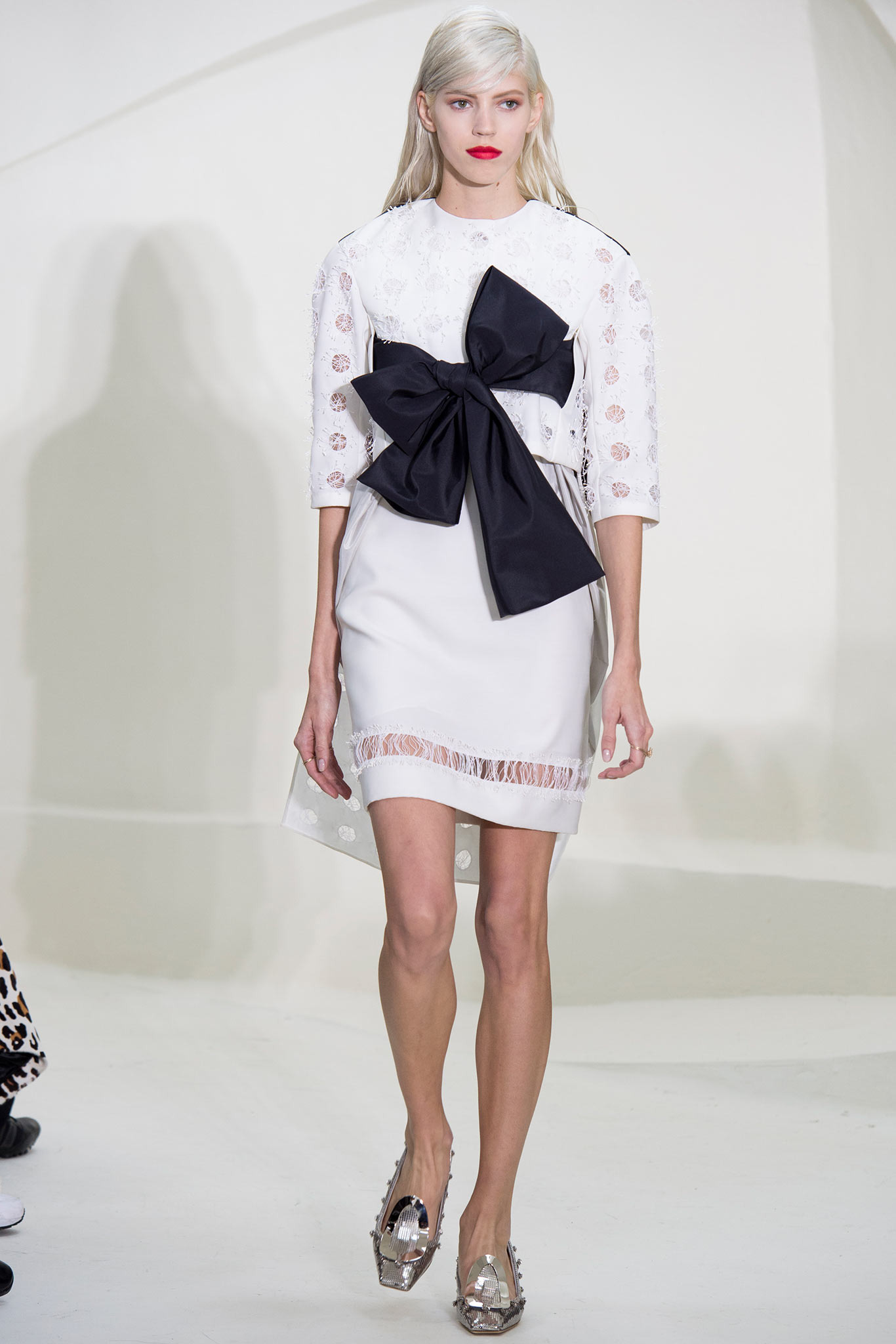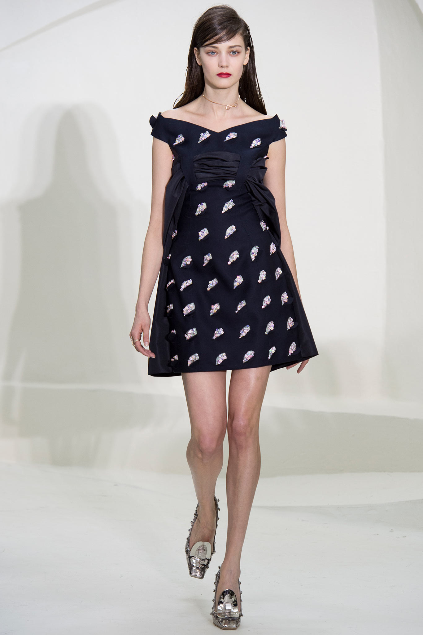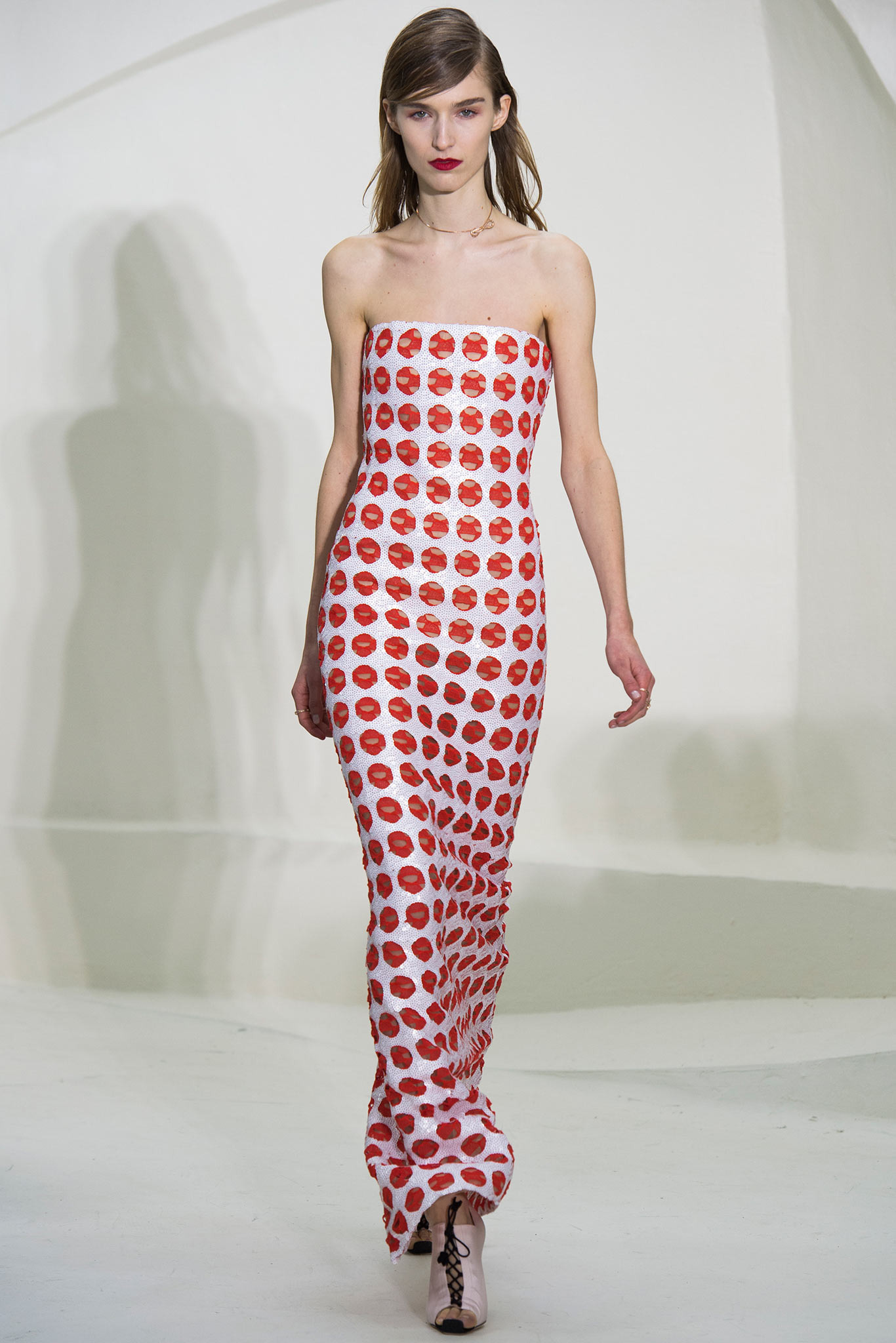 有時候都不知道Raf Simons到底還有多少令人激賞的創意藏在腦海中。當我們還在他推出的這個階段的創意中感到驚嘆不已而引頸期盼他還會帶給大家什麼樣概念延續的作品時,他就已經領先不只一步的跳到下一個階段然後讓我們飛奔去追上。在這一季的作品之中,Raf Simons把高級訂製服融合到日常生活中可以穿出門的衣服之中,而且打破所有對高級訂製服的線條想像,展出了之前沒有見過的新局面。把高級訂製服變得更現代、更摩登、更簡潔也更時髦了。這一整個系列流露出滿溢的青春活力,衣服上的細節依然精緻得驚人。從層層套疊的層次中仍有一致的縫線,打摺線條的動感,白色洋裝上的polka-dot用淺螢光綠增添衣服的活力感;上衣上縫製滿滿精緻如花瓣般的提花裝飾卻在胸口留下了童真的塗鴉,還有全新線條的高跟鞋,都是相當讓人驚艷的單品。但是Raf Simons還是把過去一些屬於Dior高訂的元素延續下來,就像是這次Jennifer Lawrence出席SAG的七彩亮片服的概念雖然仍有出現,但是卻是用不一樣的輪廓去重現設計的生命。