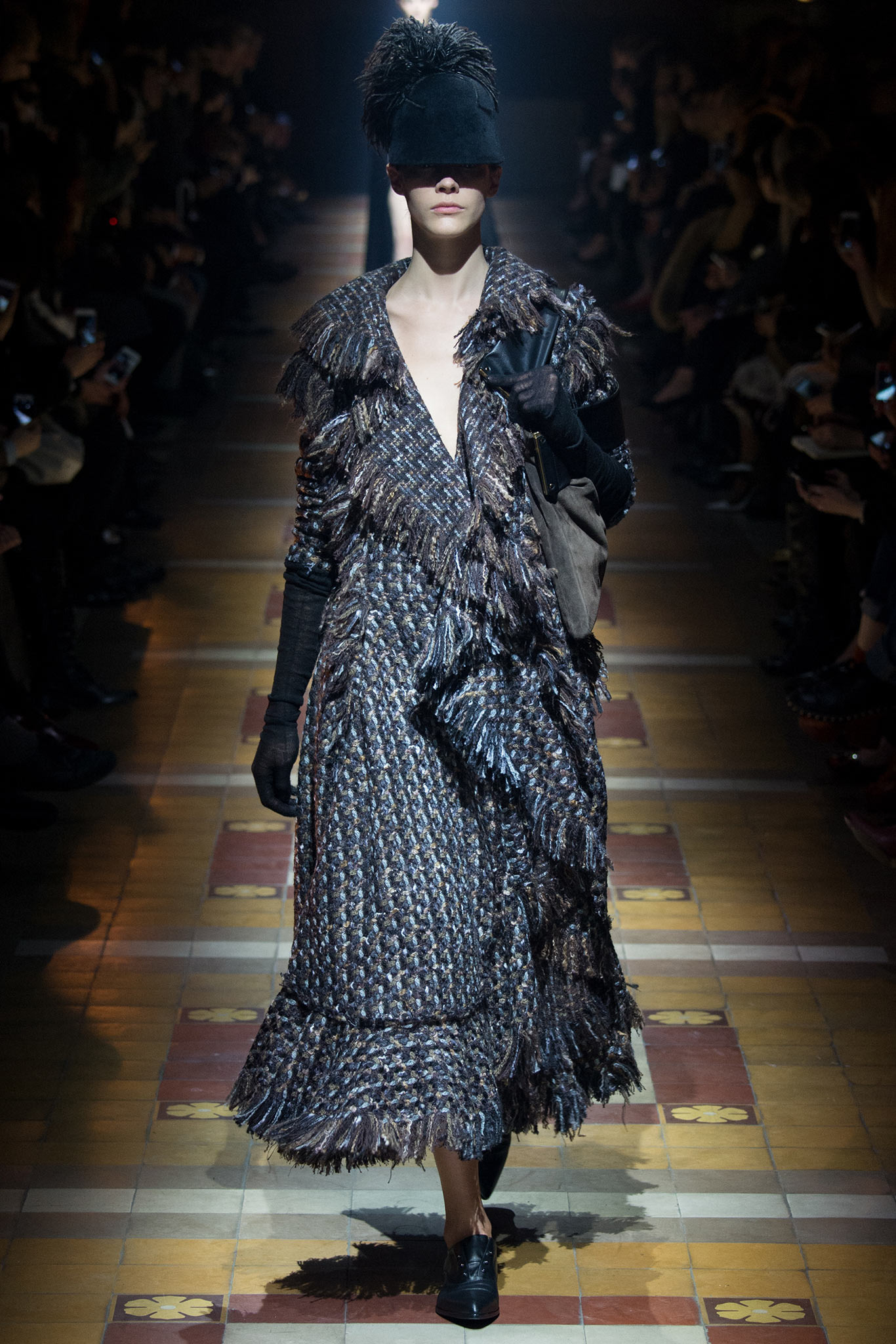 衣服的細節上,我們看到tweed的布料不收邊,反而放大了垂墜的衣穗;交錯剪裁的上衣和Bias-cut的荷葉裙很好看。之後的皮草傳達出高質感卻沒有一絲一毫奢華的感覺。肩膀上還有充斥身上的流蘇製造了流線的動感,很摩登很時髦。