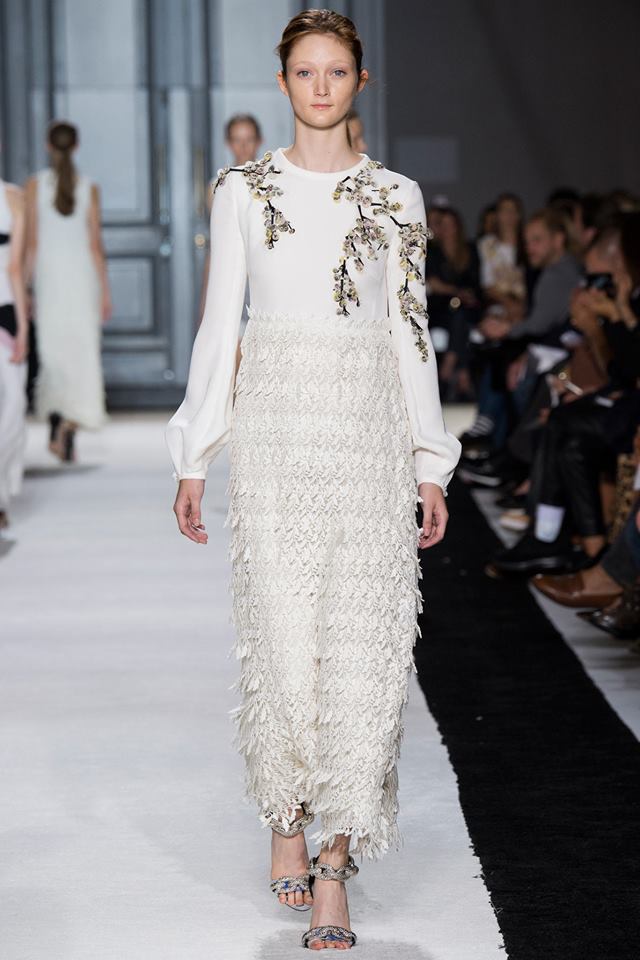 這件禮服分成上面兩截不同的面料,上半身平滑的面料就像是畫紙一般,讓設計師Giambattista Valli在上面創作出了一幅美麗的靜物畫。而下半身精緻細膩的軟呢則是把優雅做了相當好的詮釋。這套禮服配上她細膩的古典氣質,真的沒什麼可以挑剔的了!