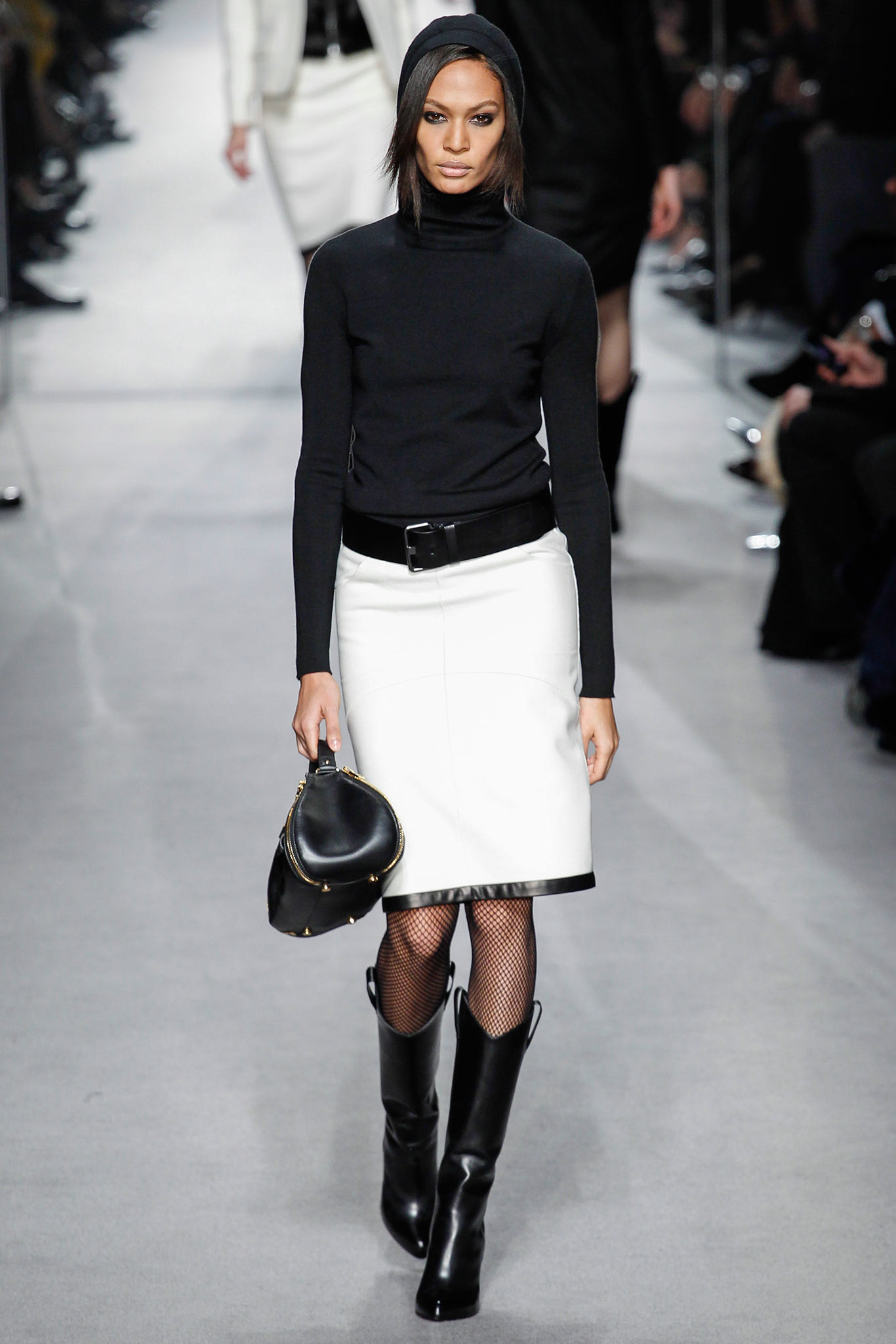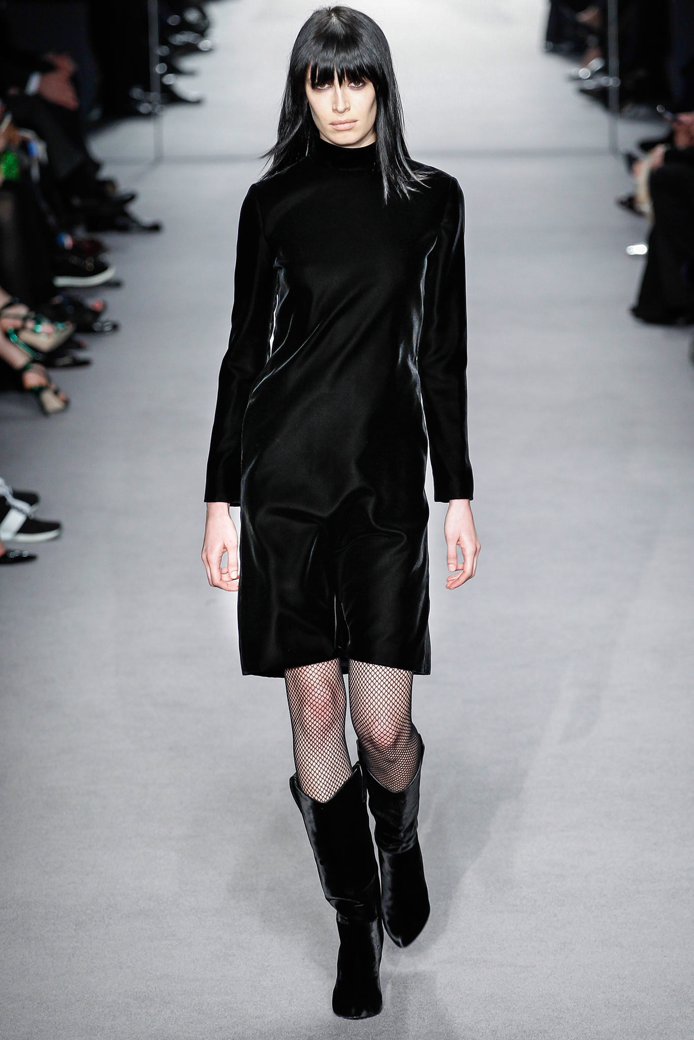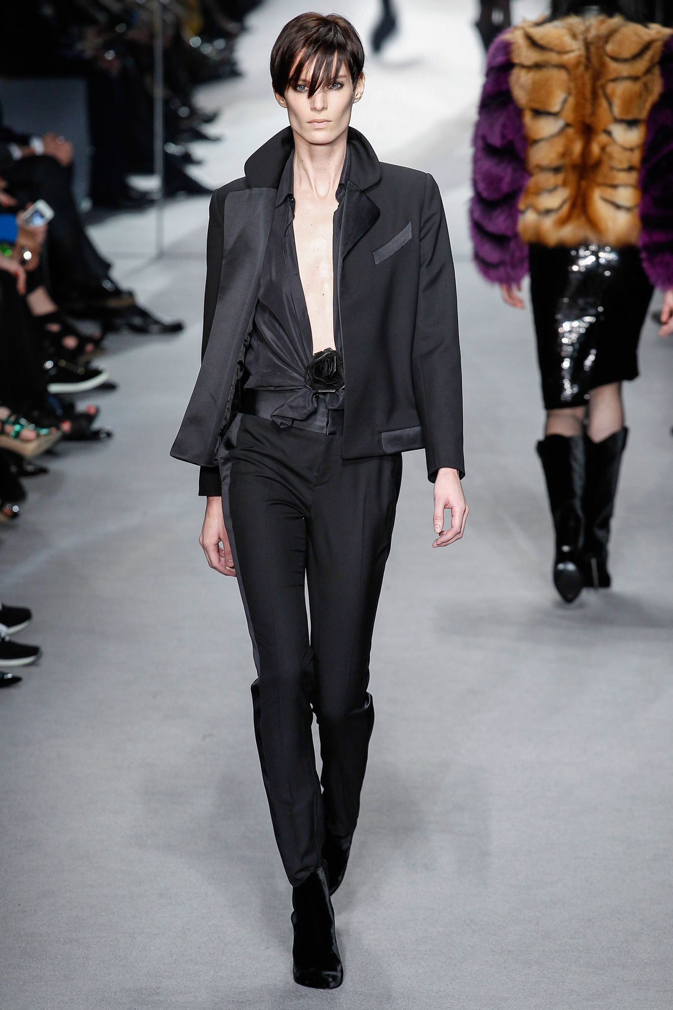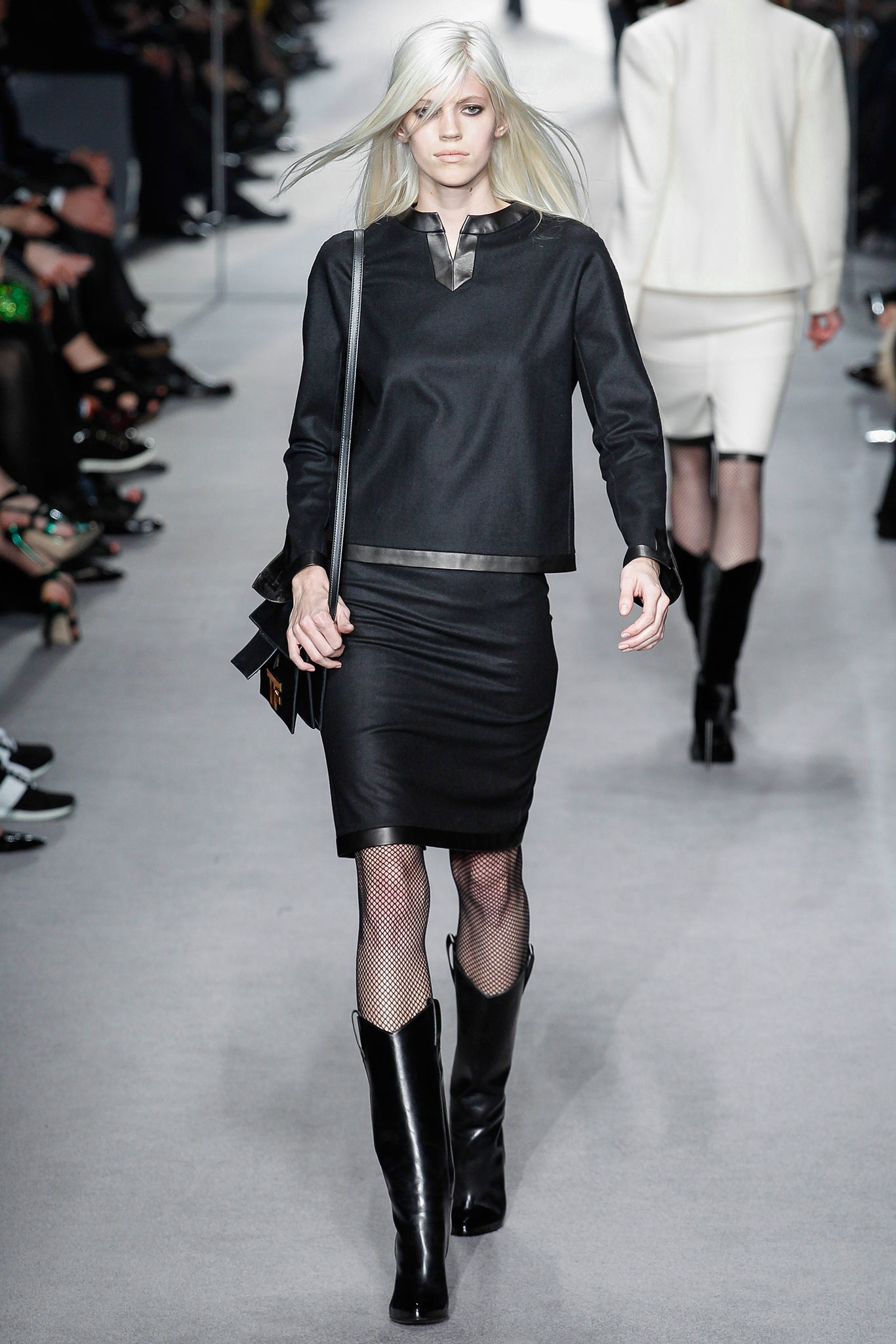 Tom Ford收起上一季的誇張與圖案風格,用簡單,優雅的線條把觀眾帶回六零年代。沒有太多花俏的剪裁,膝上鉛筆裙很時髦,大部分的衣服都是平領或是高領,但用貼身的剪裁流露出女性的身形魅力。