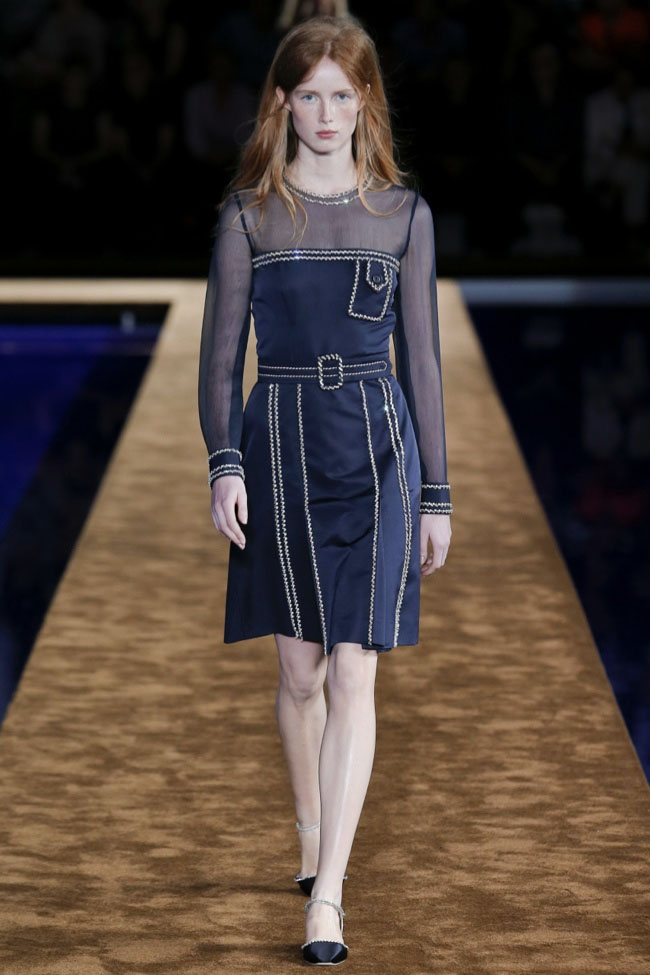 這一季Prada利用水晶製造錯視法縫線外露以及裙擺褶線的手法很別緻,讓這樣洋裝看起來很有現代藝術作品的感覺。我喜歡這個構想,但是我覺得有點太多了,至少在左胸前面的那個口袋有點多餘,失去了簡潔感。不過我倒是很喜歡她搭配的Christian Louboutin高跟鞋,帶點古典味的鞋子,和她的整體造型是蠻合襯的。