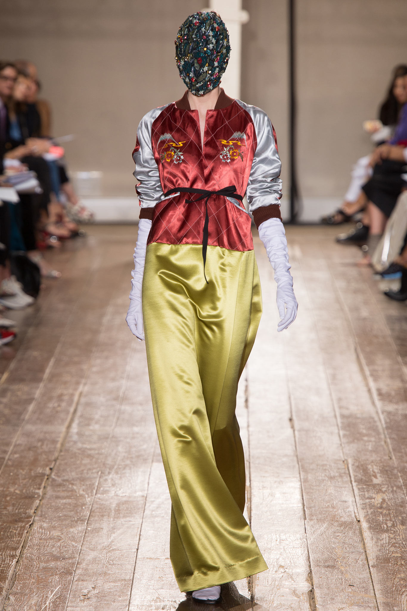 以為這樣就結束了嗎?她後來又換了一套緞面運動服,這可是Maison Martin Margiela 2014秋冬高級訂製服的壓軸款啊!!實在走得有點前面,但是這一套的視覺效果沒有上一套好,因為髮型。髮型顯得有點格格不入,休閒的酷感減少不少(我說真的,如果試試看戴那個面具出場,絕對是另一波高潮和話題!)