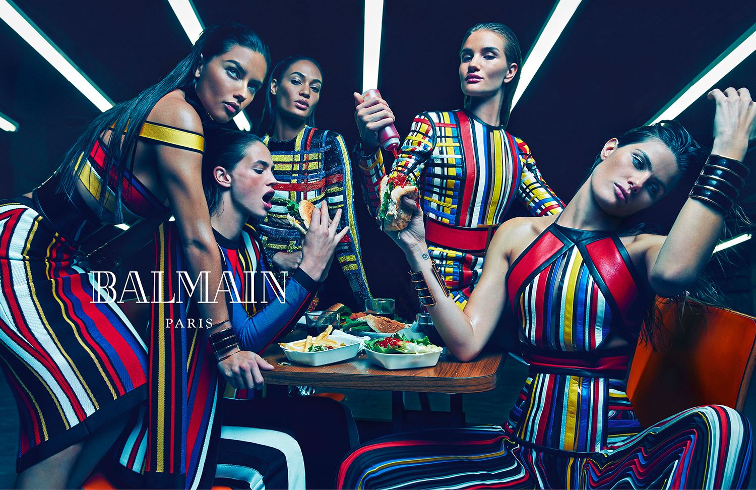 Balmain 2015春夏的大片請來了Adriana Lima, Joan Smalls, Rosie Huntington-Whiteley, Isabelli Fontana and Crista Cober五位超模共同詮釋。
