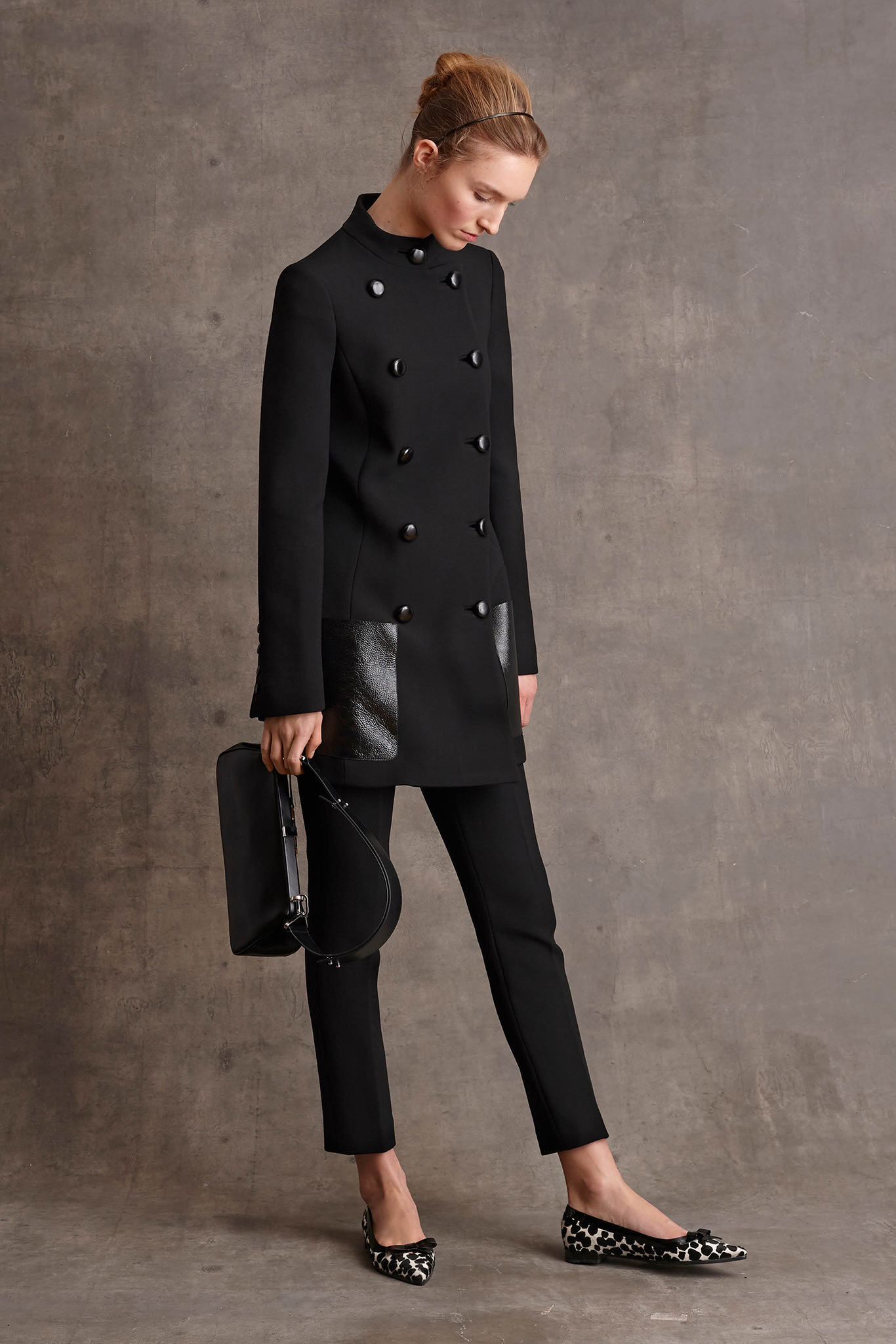 我喜歡這一套穿著的原因是因為,這應該才是一般人平常可以參考的穿著吧(笑)。看起來簡單的排釦大衣,剪裁俐落流暢,我喜歡那個肩線。而且不論是秀上搭配九分褲的穿法,或是Emma配上洋裝的穿法都很好看(就看你對寒冷的忍耐力如何了),除此之外,外套上的皮革口袋設計讓整件外套顯得不單調。