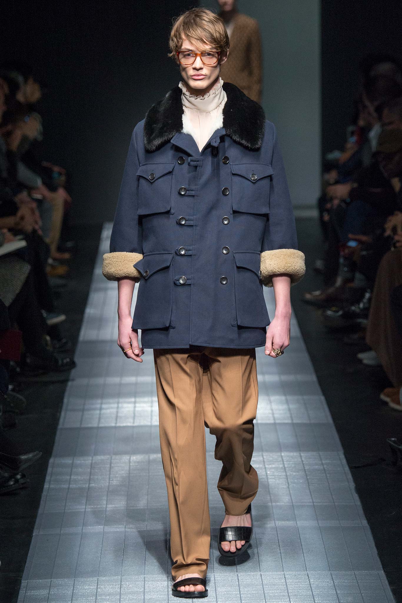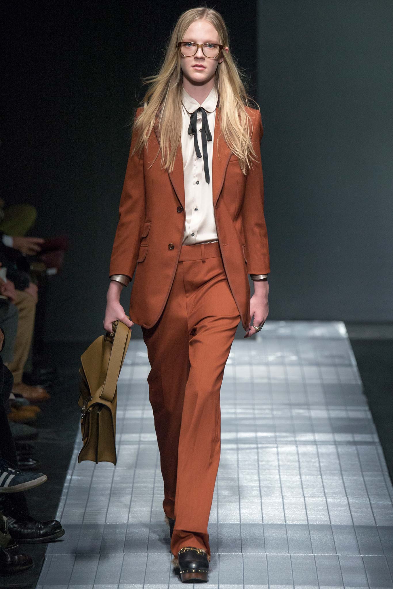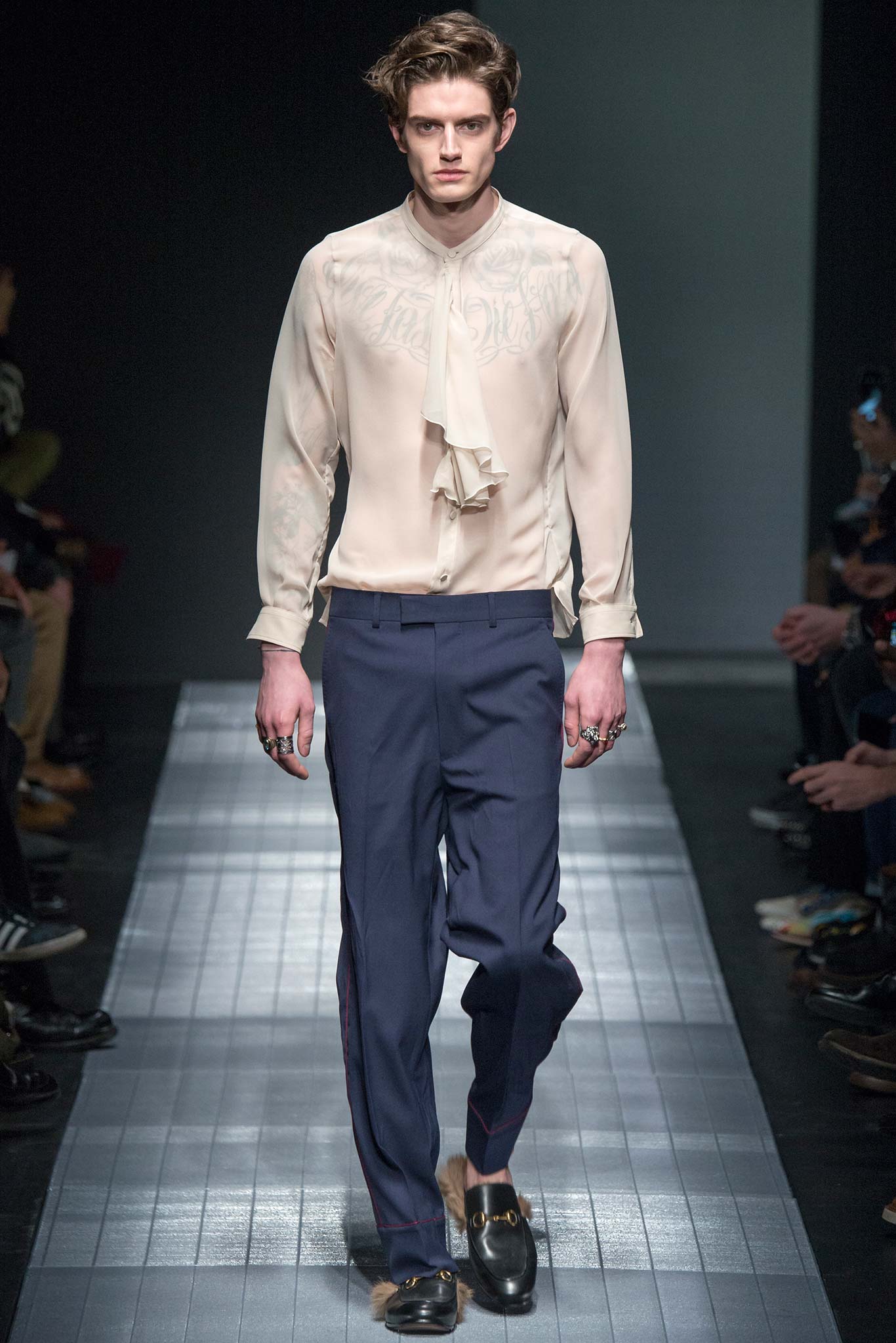 在說這一季男裝之前,先來提一下背景好了。Gucci前時尚總監離職,照理說這一季應該還是她主導的設計款式,但是就在開秀前五天,Gucci宣布要大方向調整她所留下的這季設計。從走向,風格,T台擺設,到走秀模特兒全部都重新來過。說實話,我是覺得有點難過,不過也可以感受到Gucci想要大刀闊斧破釜沈舟的決心,畢竟,我是很久沒有覺得Gucci像是一個超級名牌了。