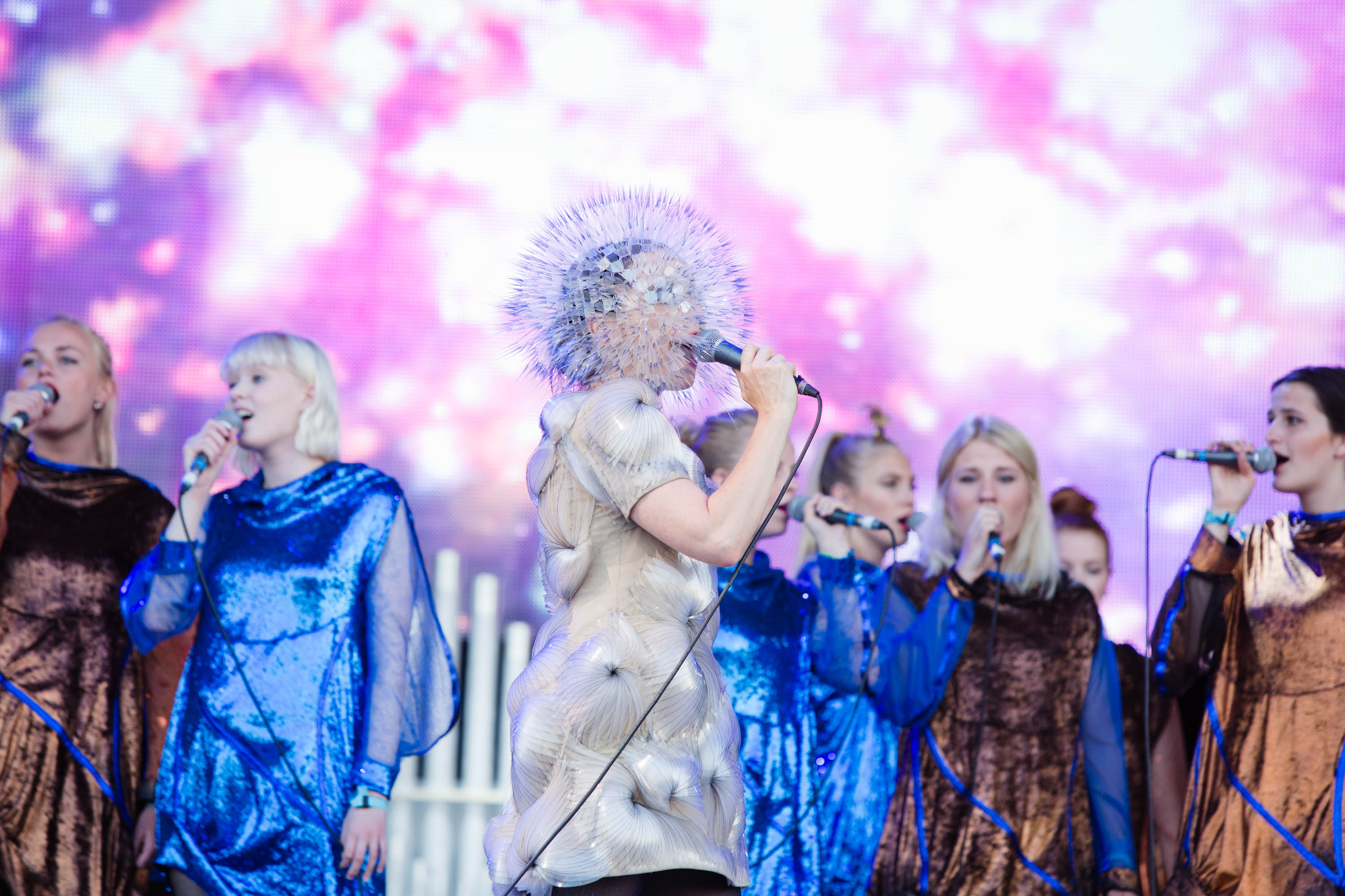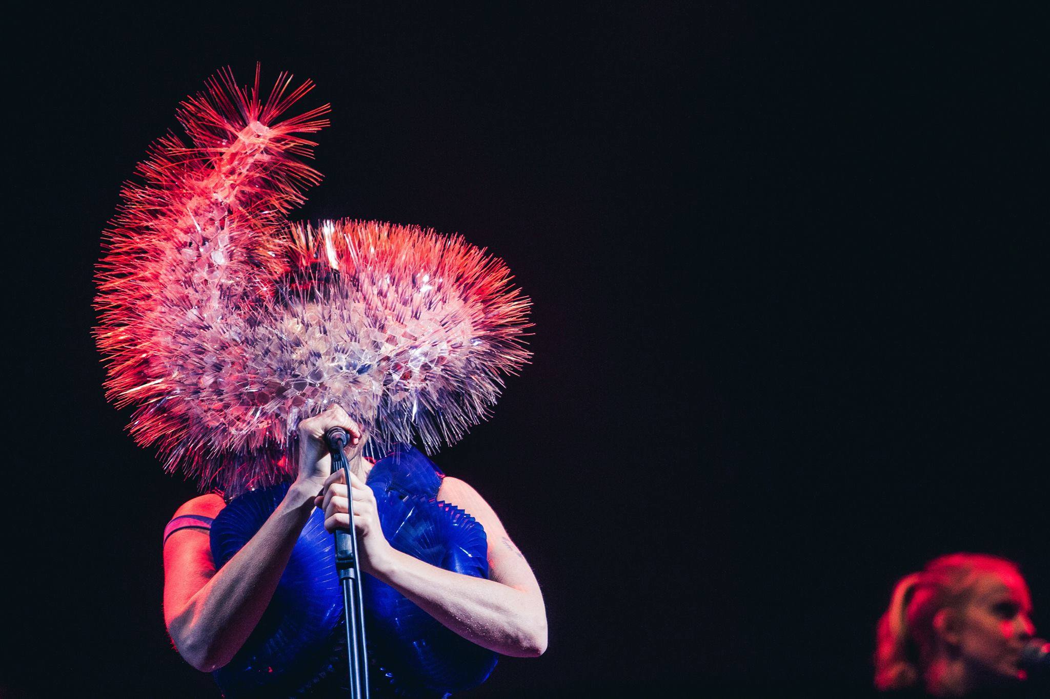 蒲公英造型頭飾是日本設計師武田麻衣子的作品「大氣圈再突入」喔,下面幾件Biophilia時期巡迴的衣服的確就是Iris Van Herpen的衣服,Vulnicura時期的MV「Black Lake」也可以再次看到Iris Van Herpen專為Bjork設計的衣服。