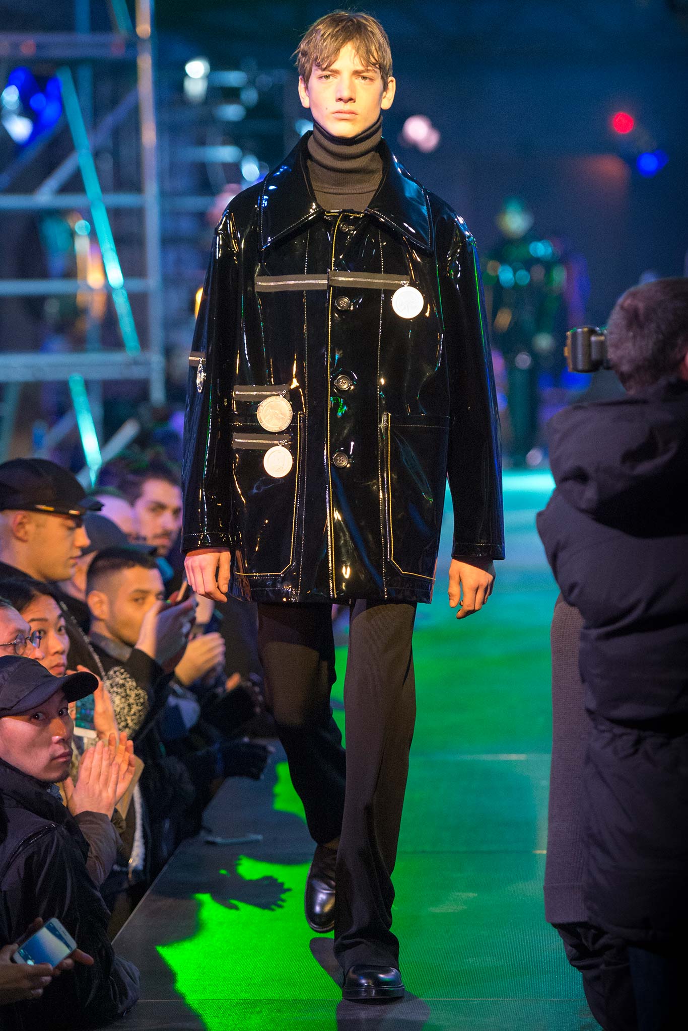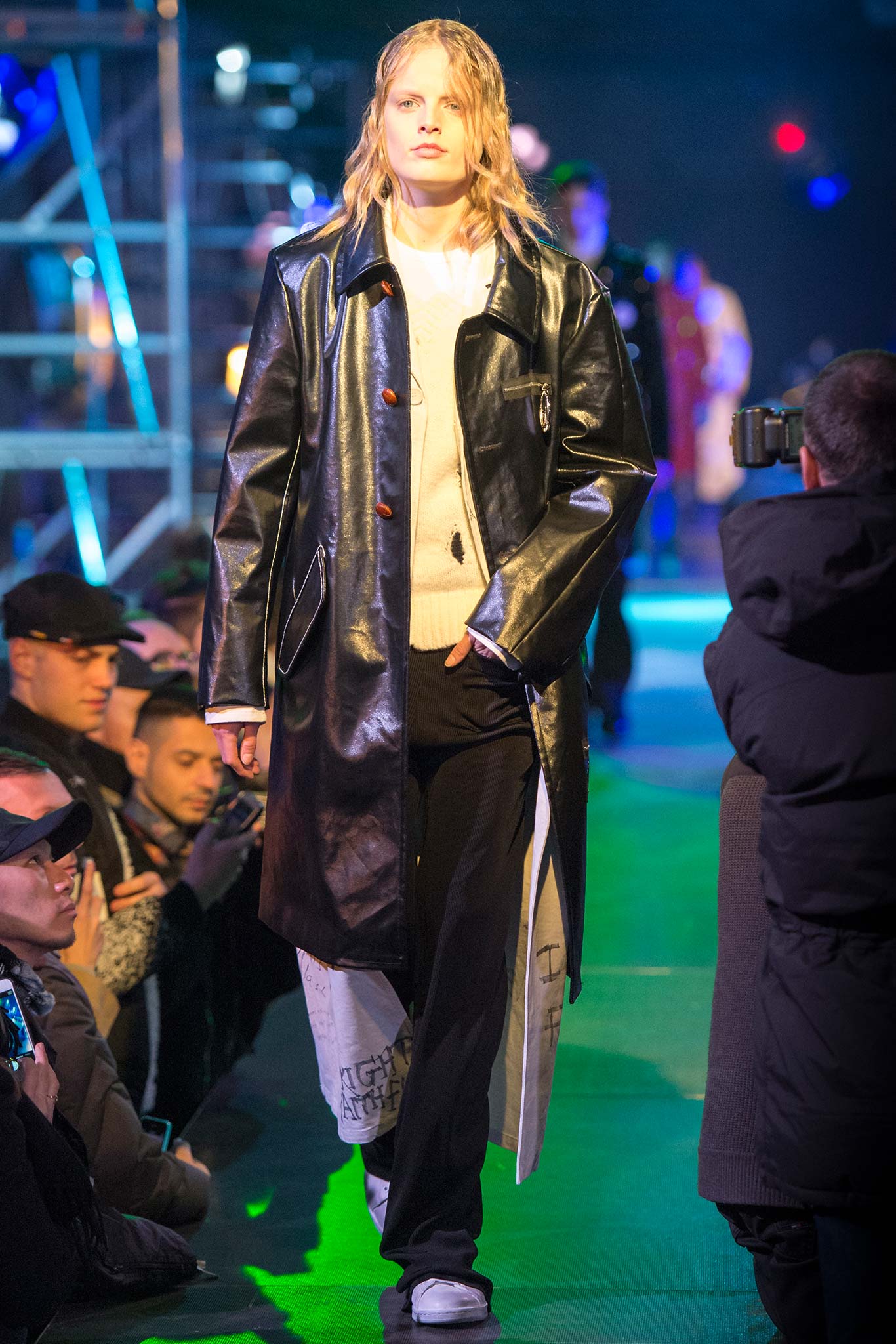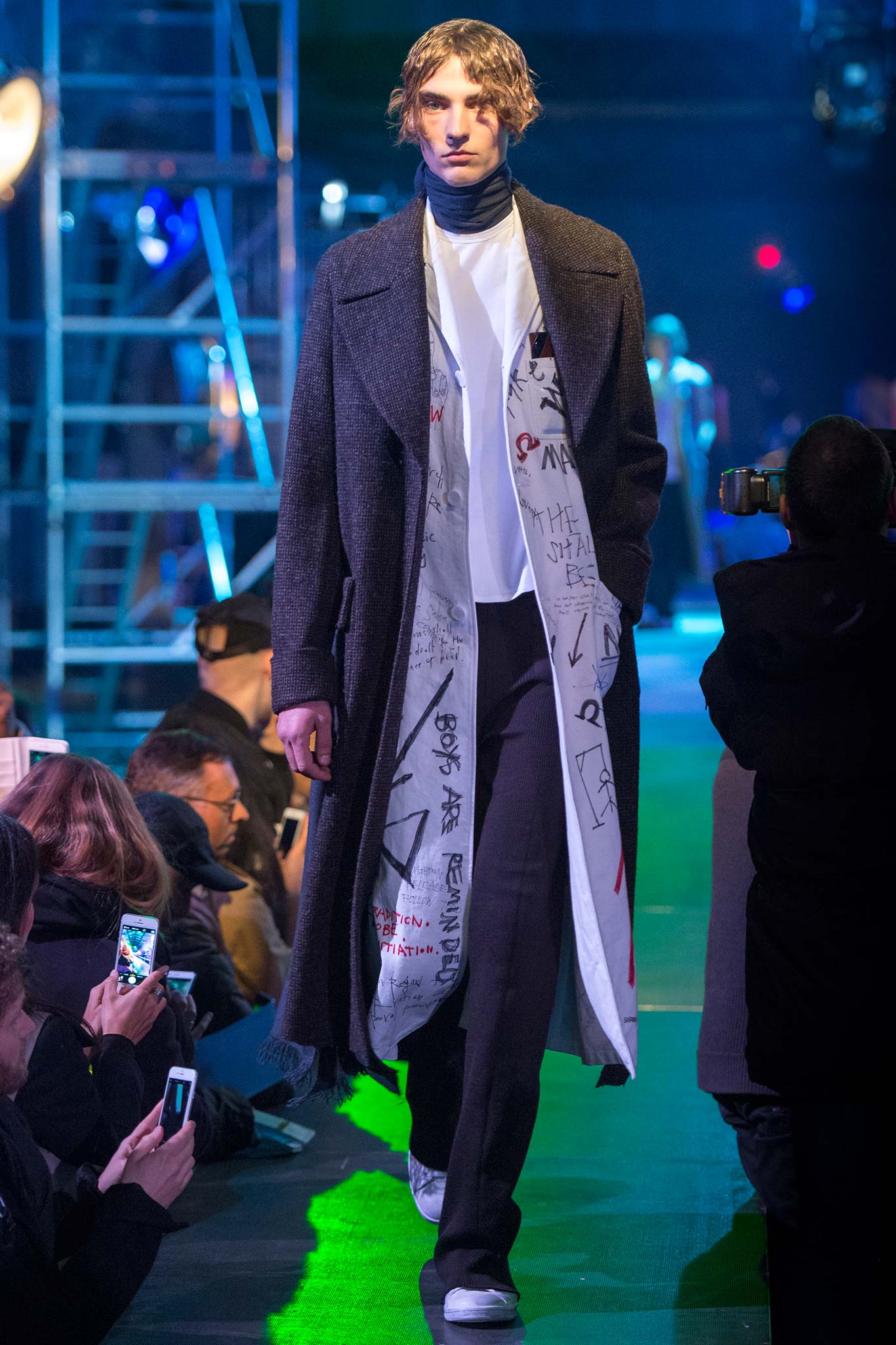 第一件單品就讓我大呼過癮,這是一件純白的長大衣,但上面卻充斥著塗鴉。這麼說好了,長大衣通常代表的是較為年長或是成熟的象徵;而塗鴉卻是在孩提時期或是在青少年時期才會做的事情,因此在一件單品上出現了這樣的衝擊,我覺得是他這個系列要強調的主要對比。