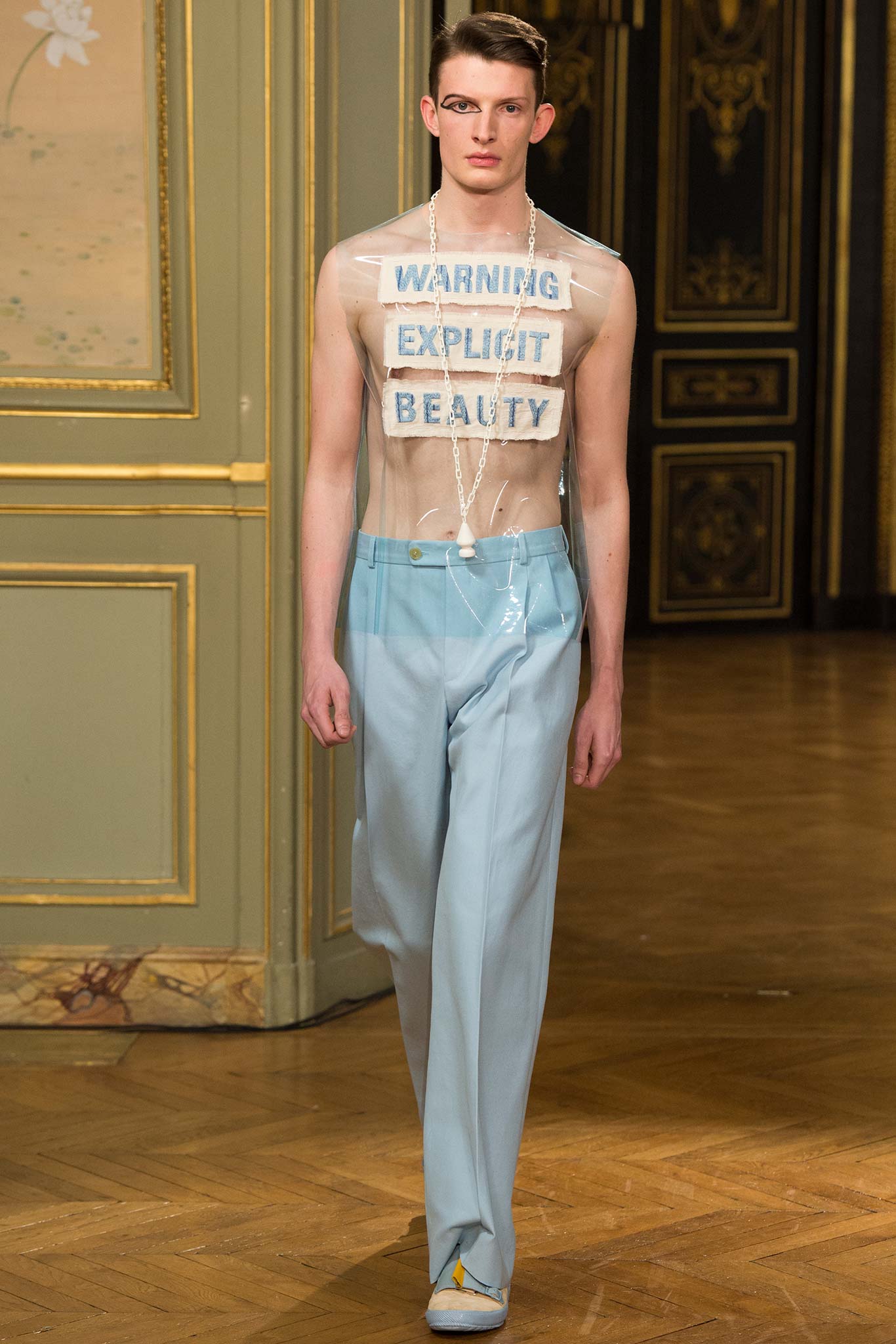 這裡所說的訊息,可不是那種抽象的美或是難以具象的概念,而是真實的訊息。我們看到第一件和第二件,上面印著了「Stop Terrorising Our World」以及「Warning Explicit Beauty」,這就是他本季主要要傳遞的訊息。