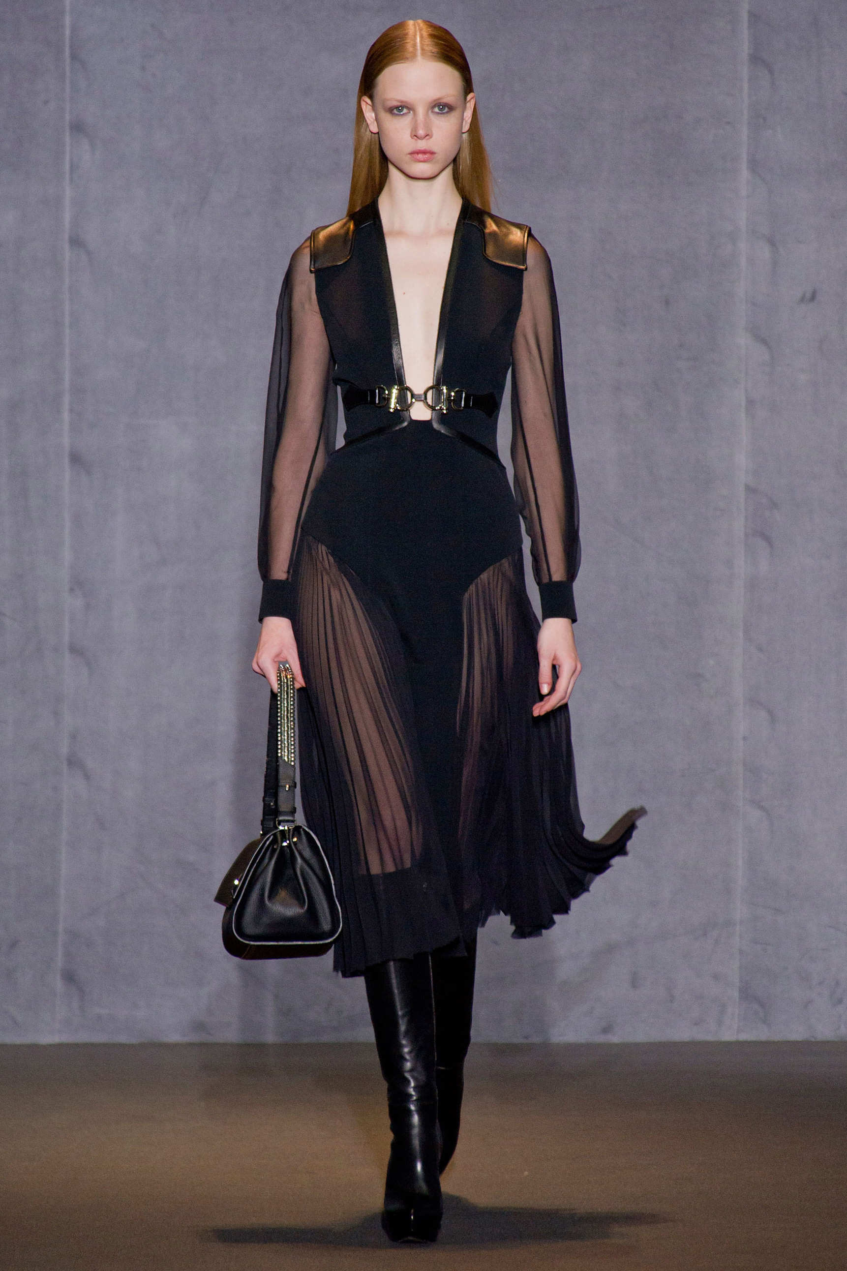 這件2014 秋冬的Andrew Gn洋裝真的很好看,不論是在胸前挖低的性感,雪紡紗的溫柔,還是皮製腰帶的力道,都融合得很好。在細節的部份,肩膀的皮革裝飾,還是那個腰帶,真是相當好看。搭配的Christian Louboutin也是極搭,髮型和煙燻妝也是有點冷艷。