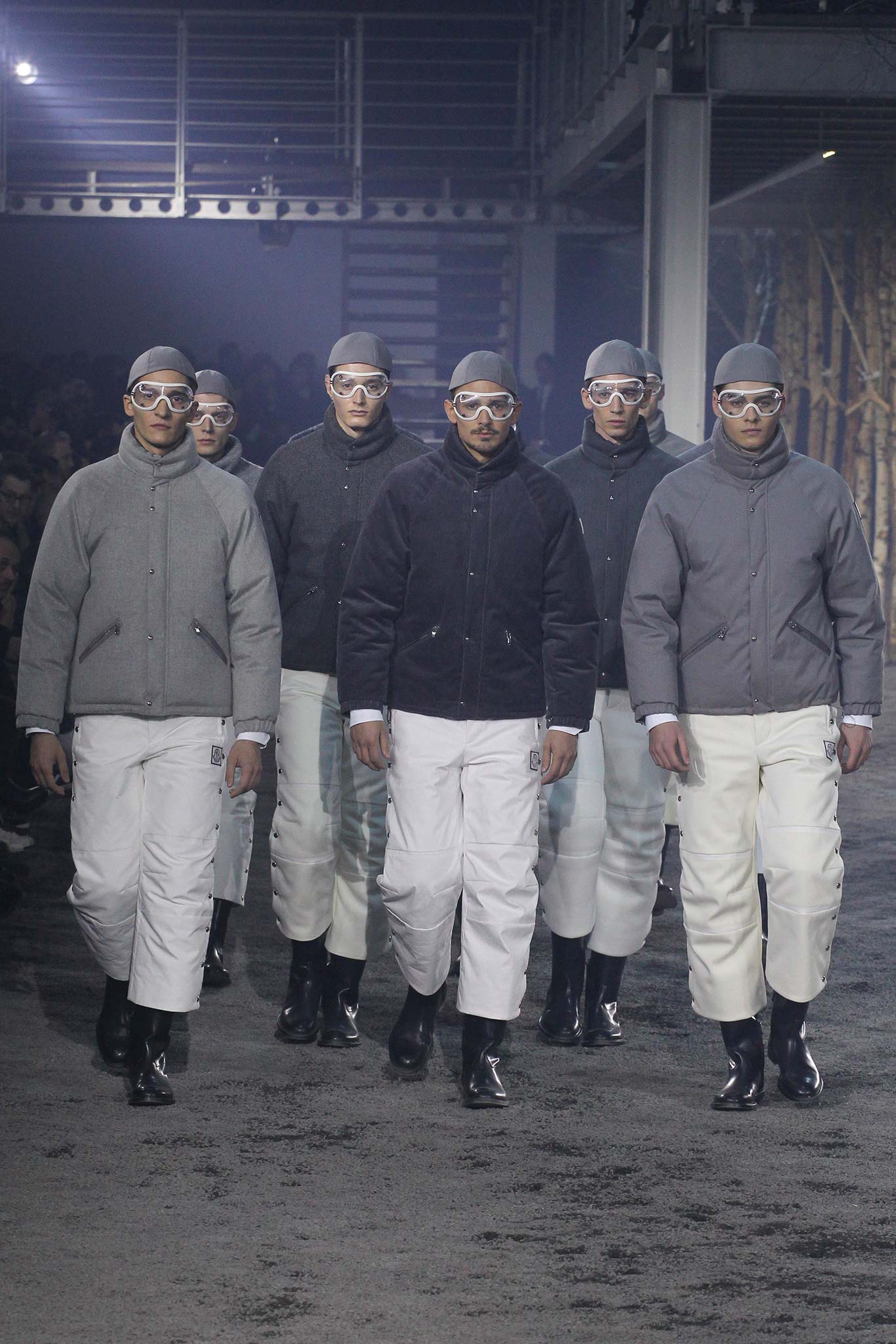 在秀的開場,有四組穿著經典款的Moncler羽絨衣(但以米色、灰色、海軍藍和黑色來做區分)的模特兒們魚貫而出。這就讓我驚喜,通常拿來結尾的手法,Thom Browne這次拿來開場,後來又是穿著這款式羽絨衣的模特兒們站妥定位以後,在閃爍的燈光下,上演了演唱會上常常出現的現場更衣。