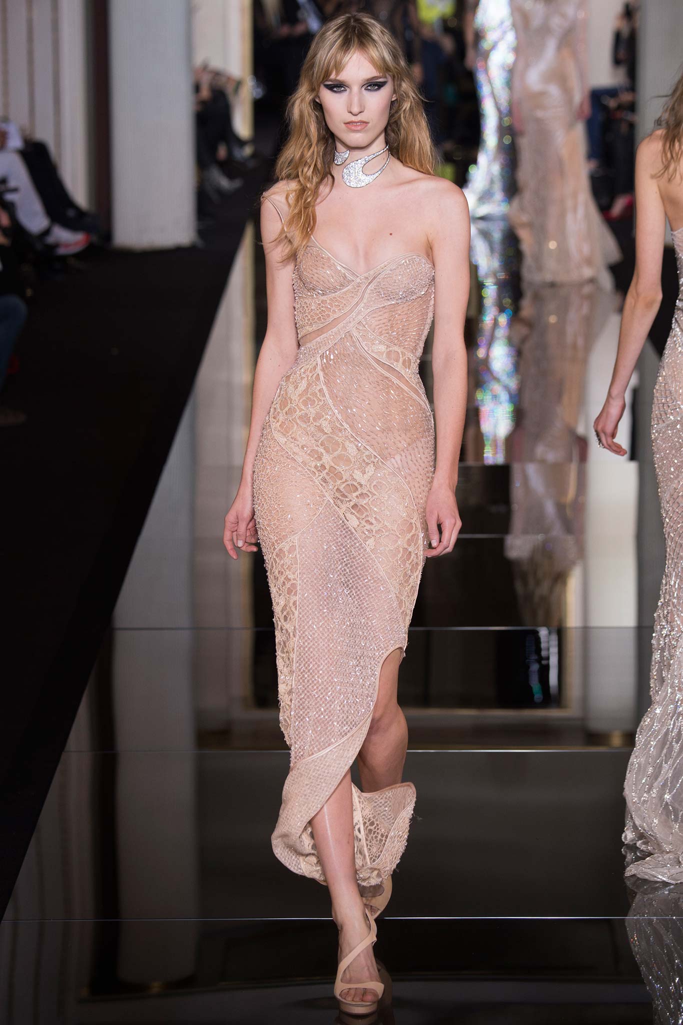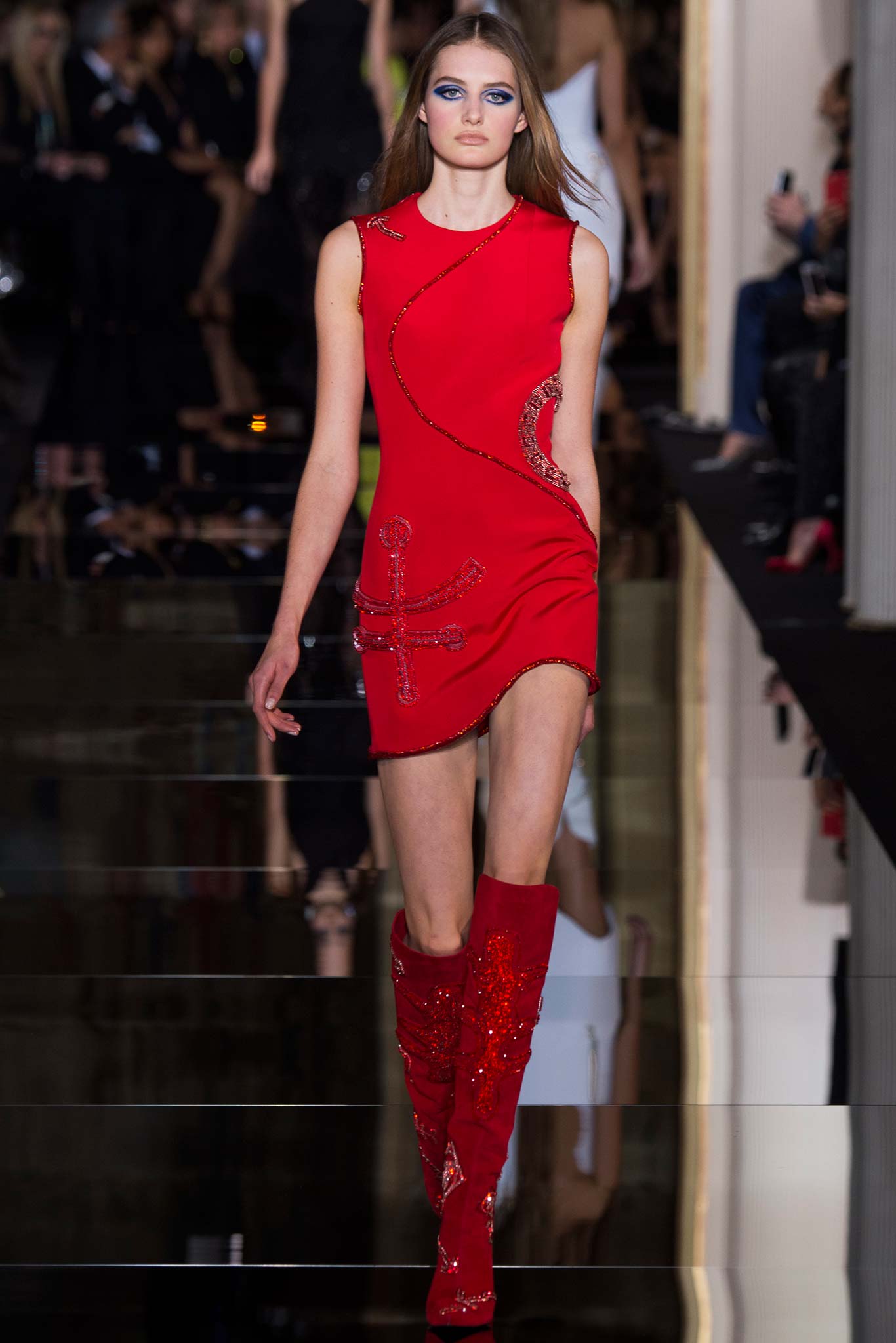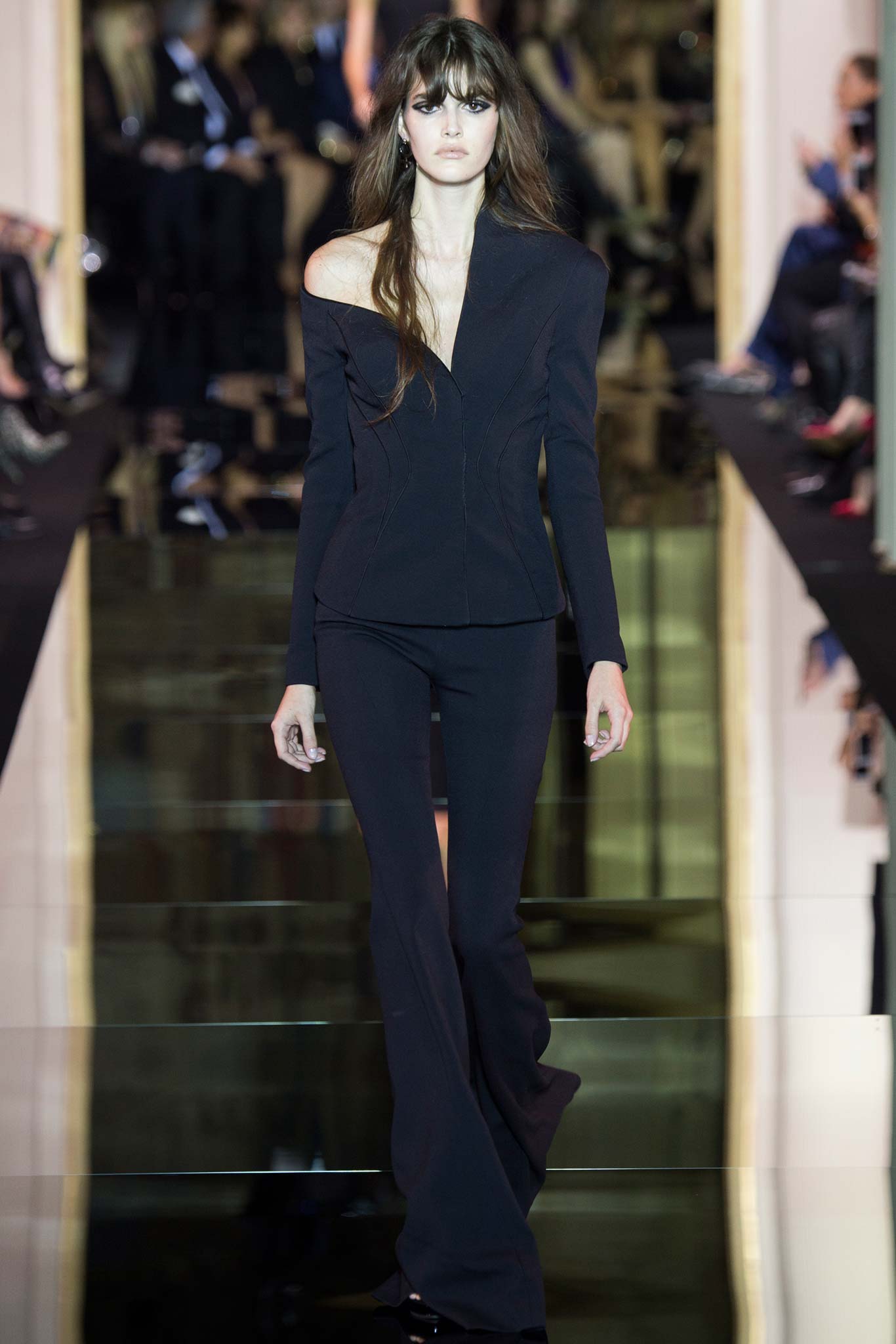 Donatella Versace把這一季的主題訂在「女人的曲線之美」,所以整個系列的剪裁還有輪廓大概都要彎彎曲曲的,幾乎看不到筆直的剪裁。另外一個重點就是在剪裁之上,所以我們一直要到十幾套才會看到高級訂製服的重要元素亮片和刺繡的應用,一開始的十幾套全部都是用布料和剪裁來彰顯這次的主題。不能否認的,我還真的很喜歡一開始的幾套褲裝。