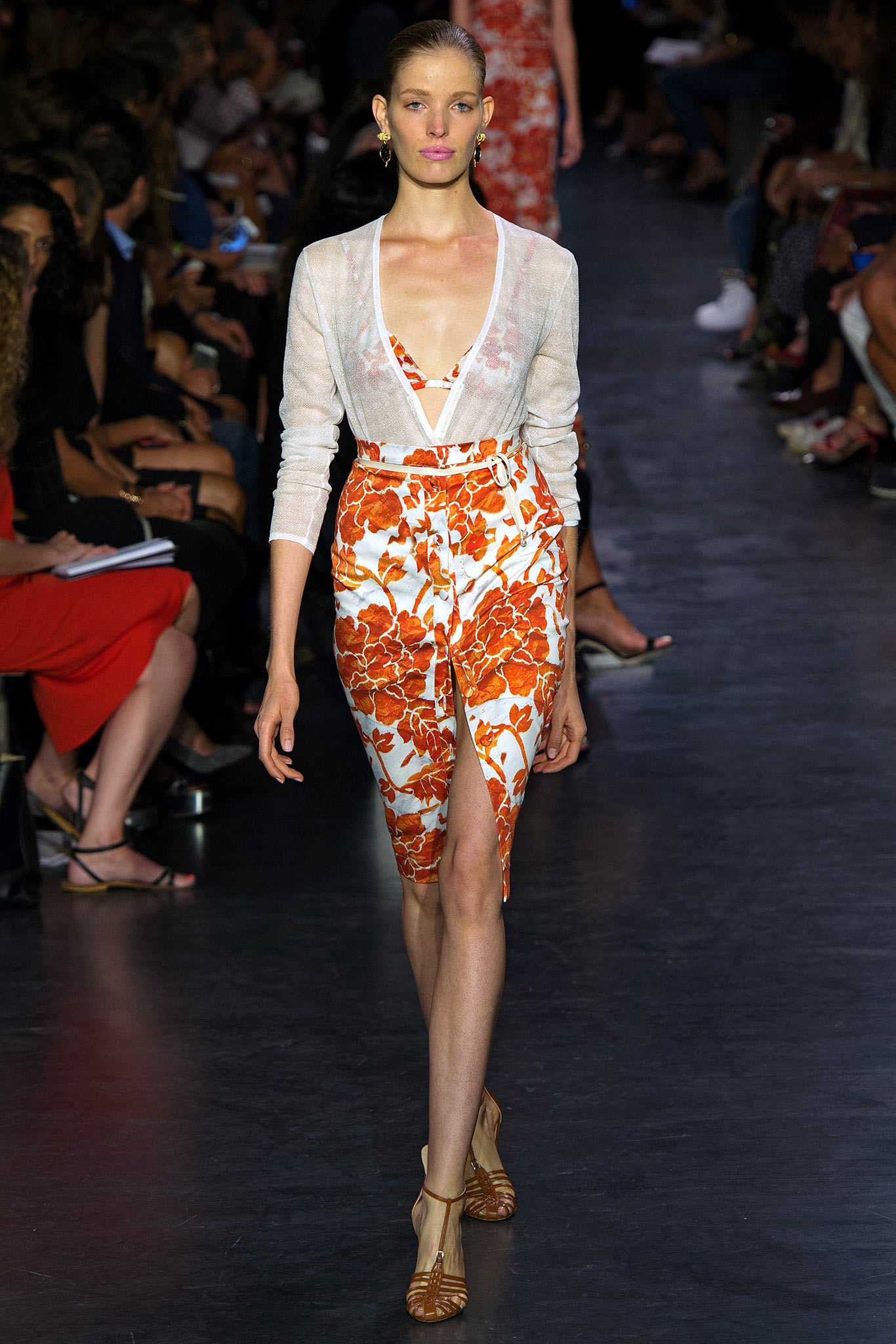 這套2015春夏,我很喜歡裙子和上身的印花,是很有氣質的調性,然後外罩有點透視感的開襟衫,有一點端莊少女要解放但是還不敢的感覺。不過相較於秀上的半解放,Rihanna 的確是豪邁多了…