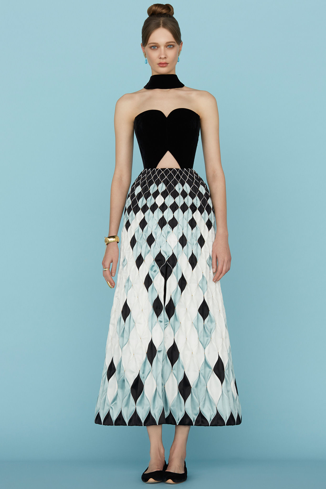 這條裙子上面拼接的菱格紋花紋實在很別緻,在配色上面也很有意思,薄荷綠、黑色和白色的拼接讓人賞心悅目,有點幾何又不致於有凌亂感,很厲害的一條裙子。雖然長度上再短一點露出腳踝就會更好,但絲毫不減我對這套衣服的喜愛。手拿包也是精心挑選配過色的喔,讚讚。