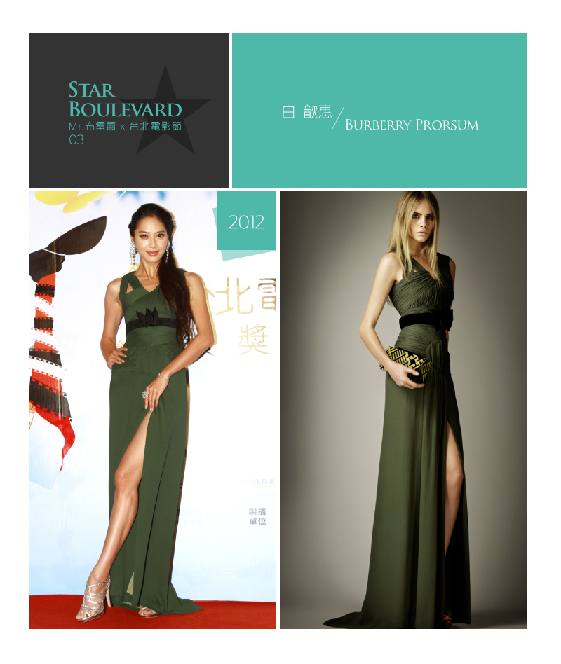 這一套2012早秋的Burberry Prorsum靈感發想來自二次大戰前的英國,有一股復古的低調華麗感。整件禮服上面有很多讓人愛不釋手的細節,像是上半身交叉的抓皺,強調腰身的黑色蝴蝶結腰帶,裙子的垂墜設計非常流暢,而裙襬的高衩更是表露性感的亮點設計,也因此整件禮服兼具氣質和性感的元素。而白歆惠真不愧是名模,把這一套禮服駕馭得很不錯,而她當然不會錯過可以展露美腿的機會,因此當天的照片她幾乎都是擺出安潔莉納裘莉(Angelina Jolie)在2012奧斯卡上讓全世界印象深刻的黃金右腿姿勢(只是白白在這裡露的是左腿),性感指數相當高,而且也有女神感!