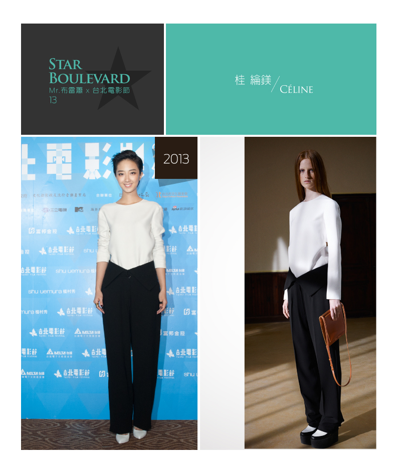 桂綸鎂選擇的是Céline 2013年早秋系列的黑白褲裝,在剪裁上非常俐落,一點都不拖泥帶水,把她率性瀟灑的一面表現得淋漓盡致。而在細節上更是不能小覷,上衣的面料看來質地很挺,但是在線條上面卻顯得相對柔軟,褲子的輪廓不走合身而是寬鬆路線,製造了愜意的舒適感,而在褲頭的V型剪裁以及反摺設計則是製造了一些剛強。剛中帶柔而在柔中又帶著剛,這樣子彼此呼應,配上白色高跟鞋,還有妝髮,充分傳達出知性率性又帶有智慧的感覺,真的是相當完整又完美的紅毯裝束。