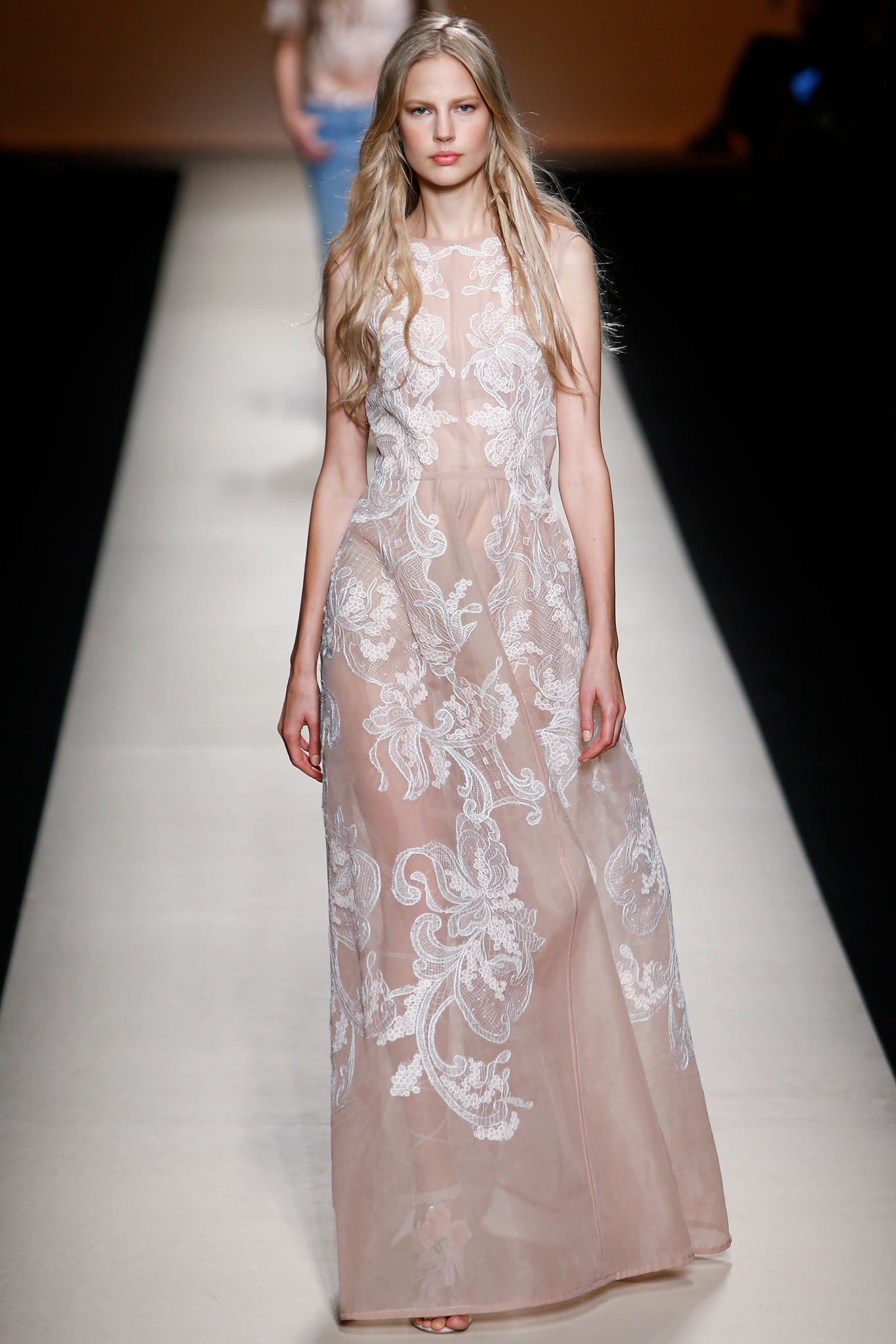 秀上這一套禮服我真的覺得超浪漫的,略透的粉膚色薄紗為基底,上面繡滿了精緻的白色刺繡,相當細膩精緻也很出世氣質。但是怎麼Ellie穿起來完全不是這麼回事(默)。