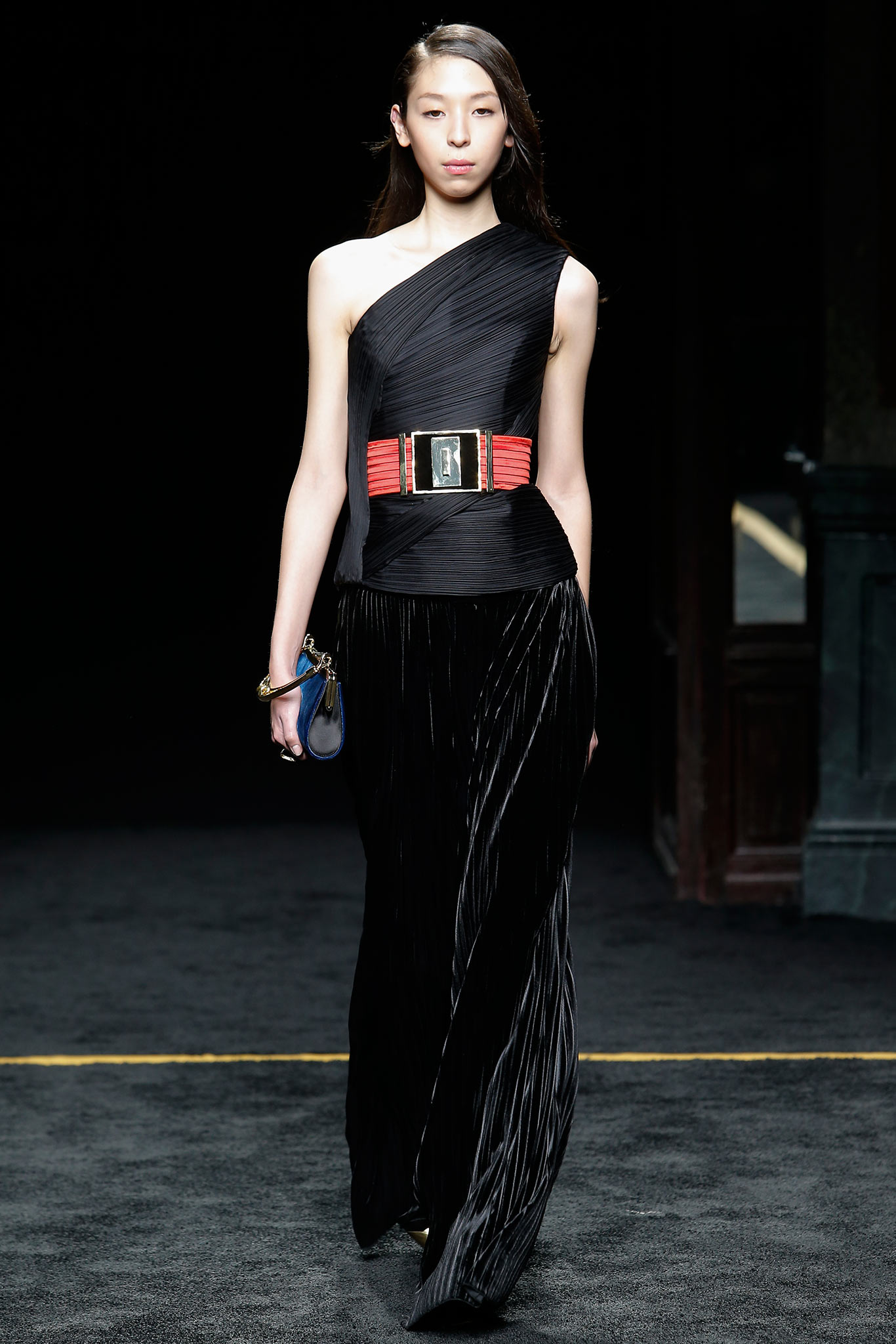 我覺得這一季他有刻意收斂了一點他的表現手法,比較雅(相對於自己的過去來說),我特別喜歡他在各式顏色的拼接處理上面,有著搖滾精神又有個人主義。一件又一件的流蘇,亮片處理過的衣服很有氣勢,寬版腰帶帶著些許復古,交叉皮革的設計也蠻摩登的。雷射鏤空處理過的黑色寬褲版型好,也性感,各式外套都用較寬的黑色做收邊是我喜歡的風格。不過Joan Smalls 穿的一款收腿版型的褲子,連她穿都看起來大腿粗,我想一般人很難駕馭得好。