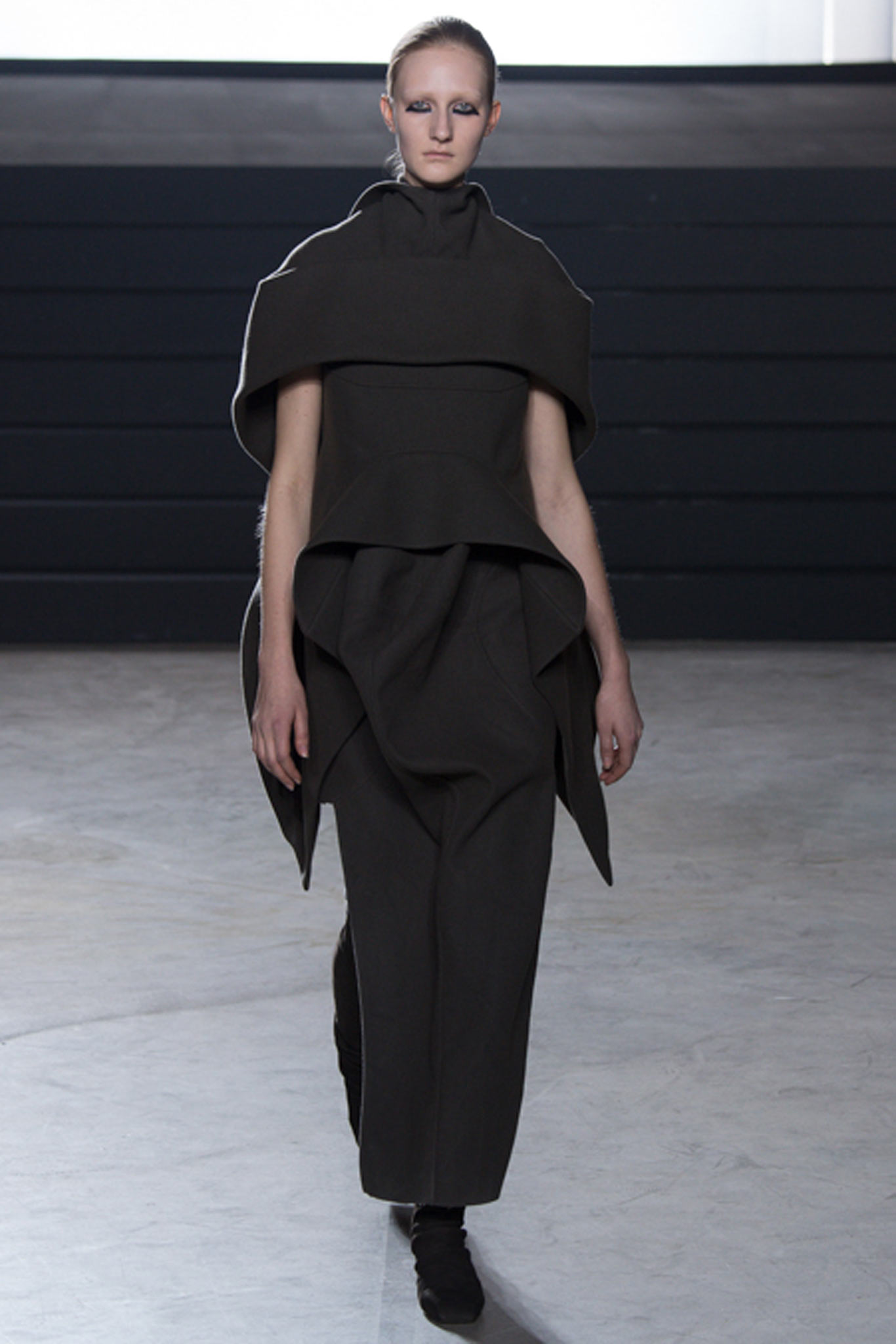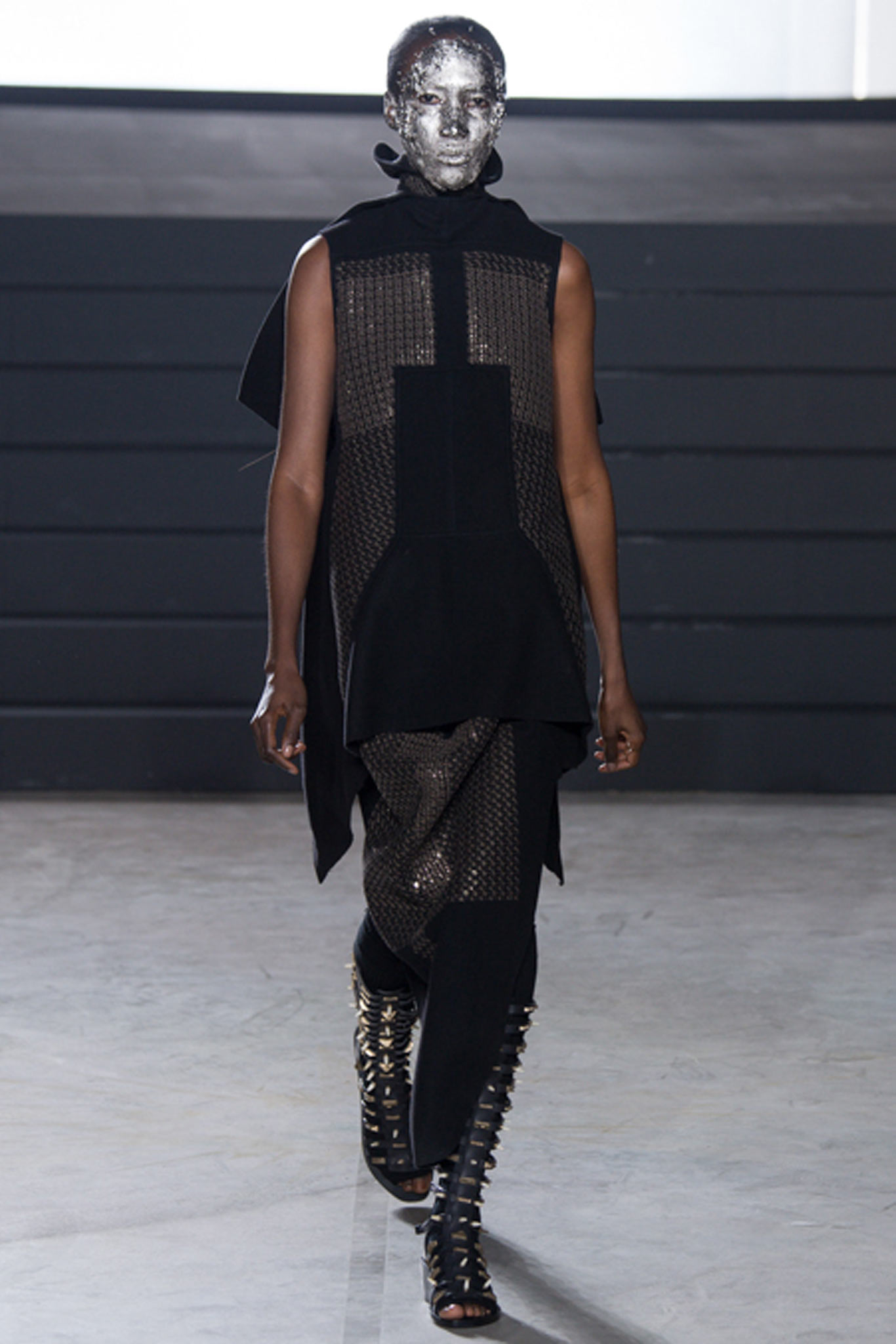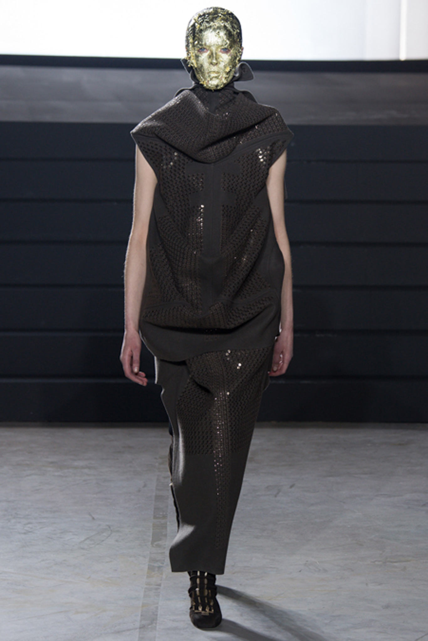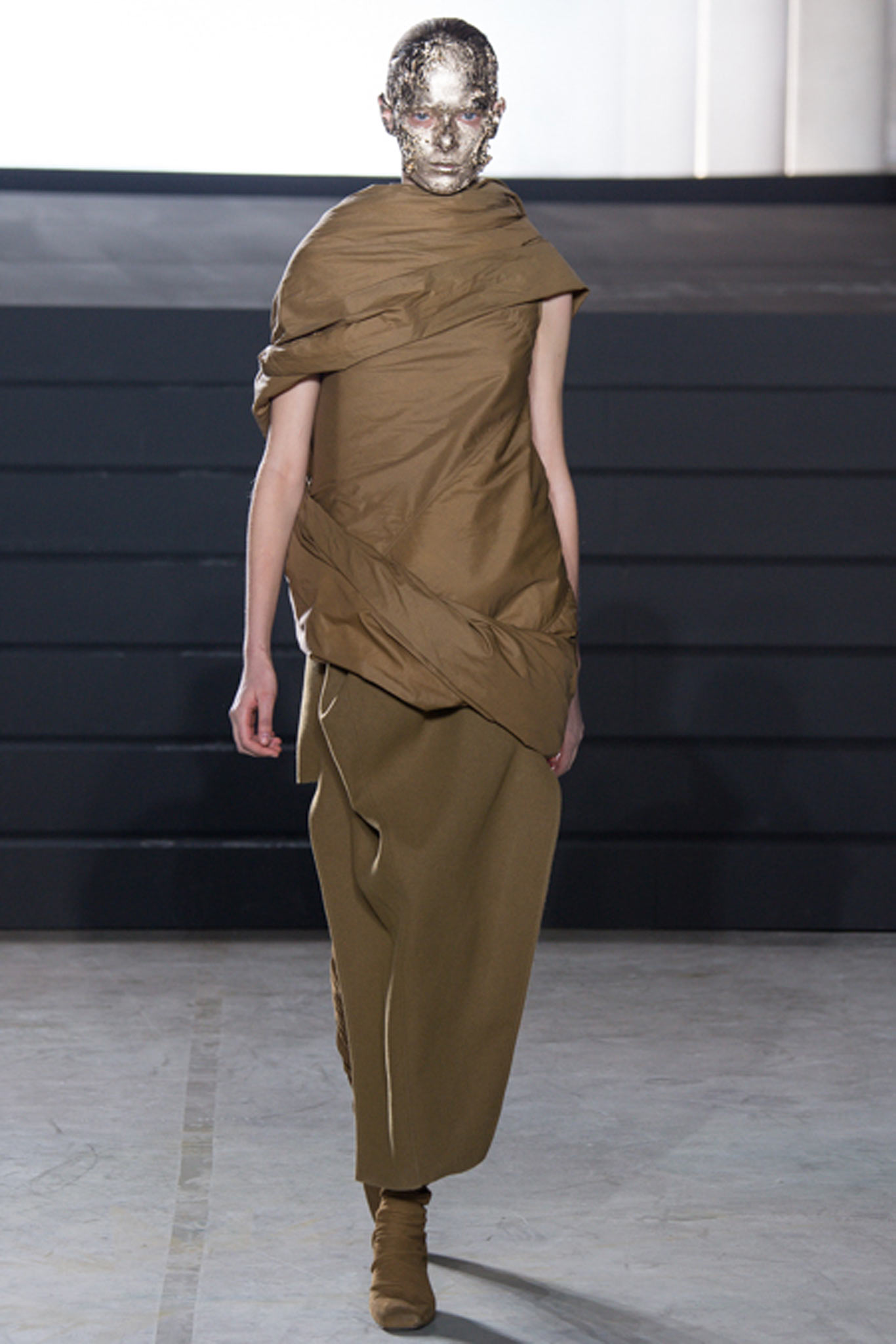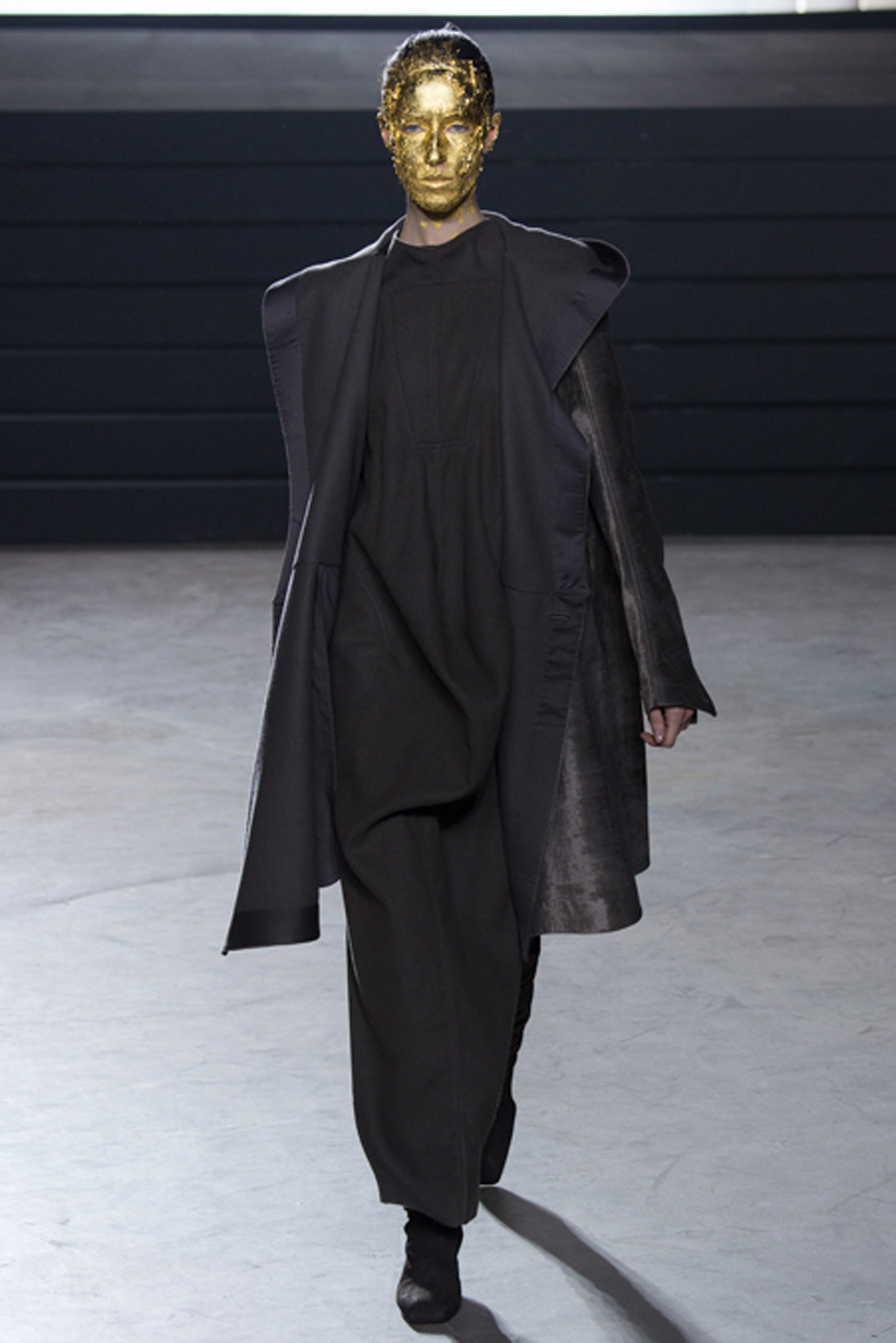 這一季另外一個亮點就是在臉上塗滿金箔的模特兒了,拉遠人的距離,反而和這一季衣服的靈感更有所呼應,我很喜歡這一季的Rick Owens。