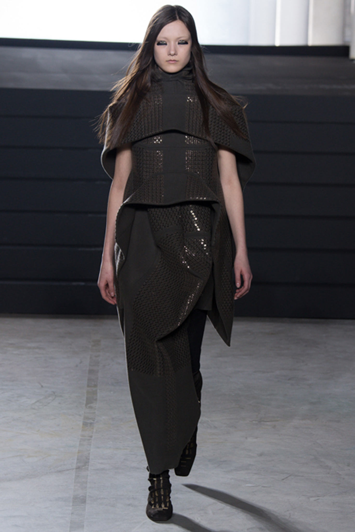不過這一場秀也算是Rick Owens的一個創舉,因為他首次使用了「亮片」這個元素。而亮片這個元素又可以和他這一次的「瑪雅」文明想法(他母親是墨西哥出生)有所呼應連結。我們可以看到在服裝上面亮片的拼貼很細膩,也很有結構性,很像是祭祀時要穿的神袍一般帶點神聖感。