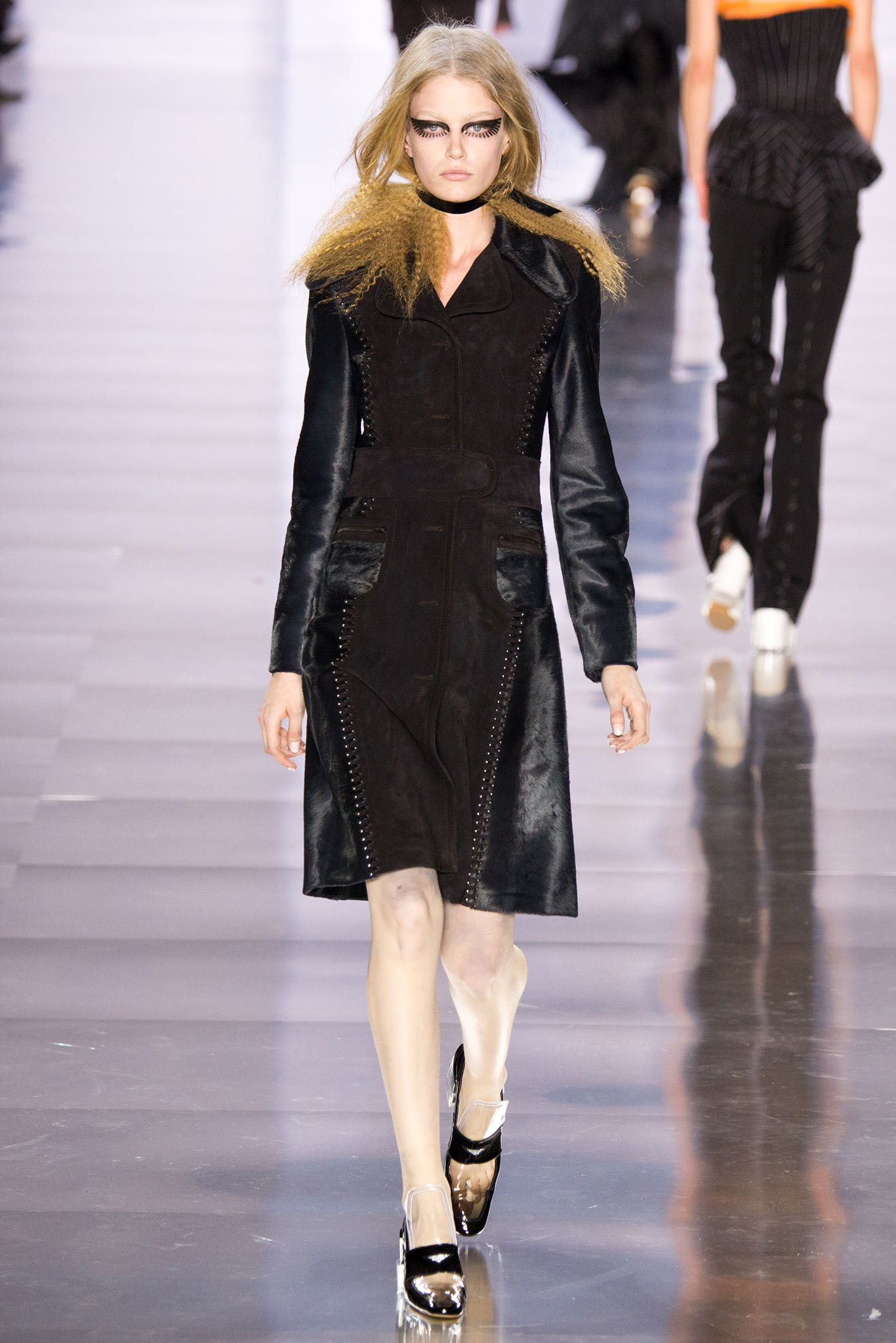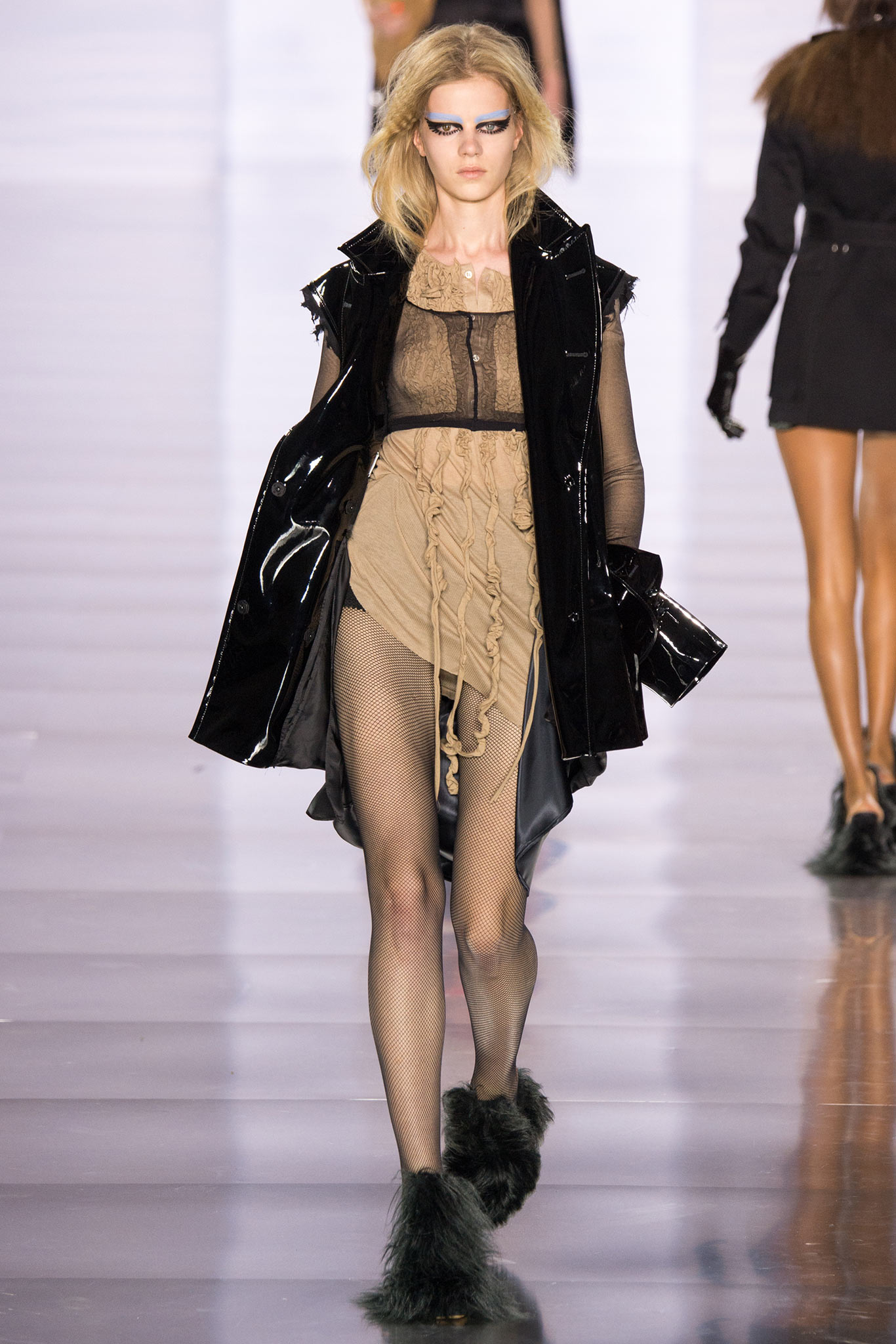 另外一個讓我非常喜歡的是他表現這場秀的方式。我們可以很清楚地看到,上台的models們分成兩個部分,一半是畫著黑色眼妝,平鋪直敘地演繹這個服裝系列,另一半則是畫著 Galliano招牌誇張戲劇效果的眼妝,穿著Maison Margiela的衣服,走著略顯誇張的台步(有的像是逆風困難前進,有的像是桀驁不遜,有的像是驕傲裨睨,也有的像是懷抱著什麼珍貴的寶物般小心翼翼地前進)。