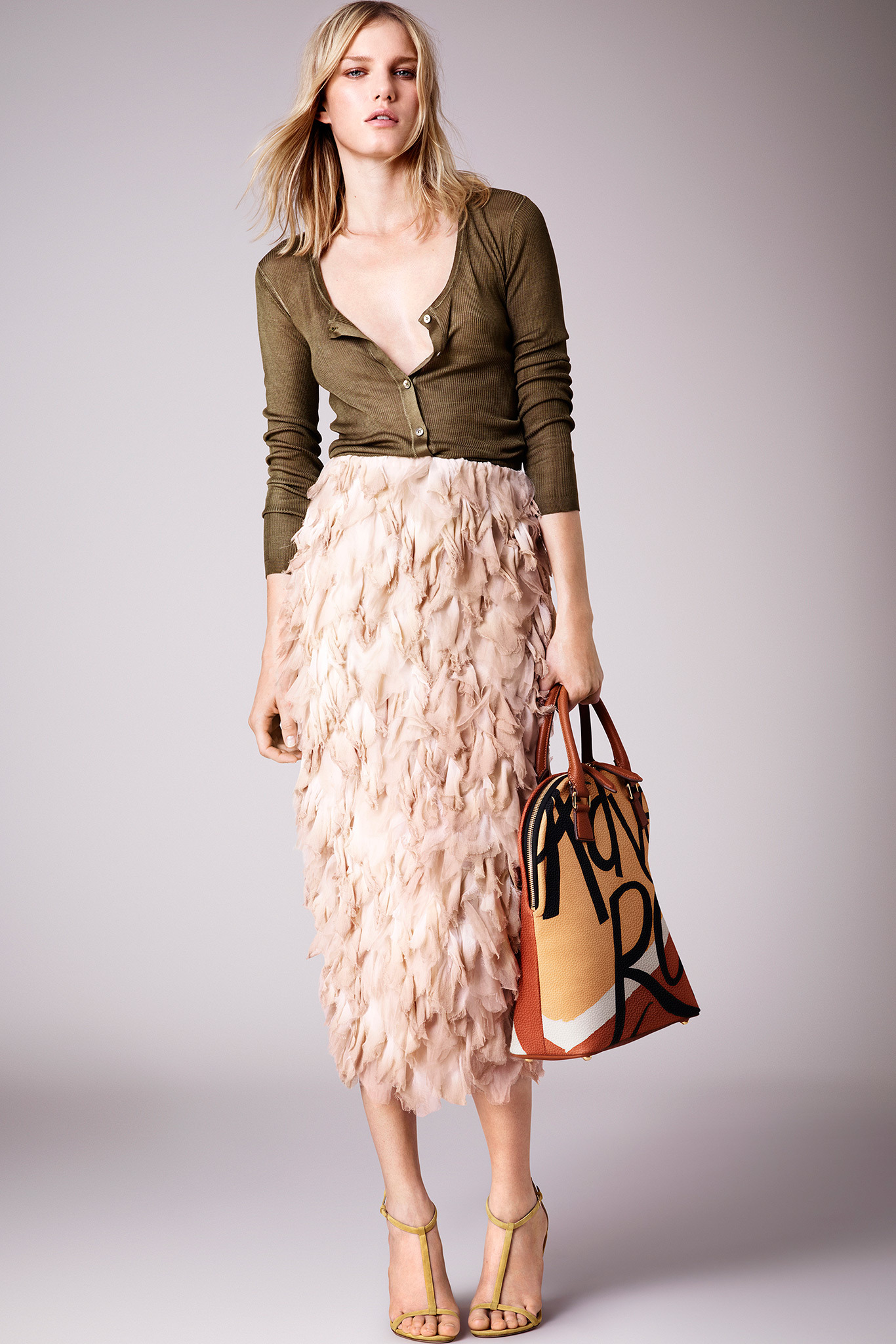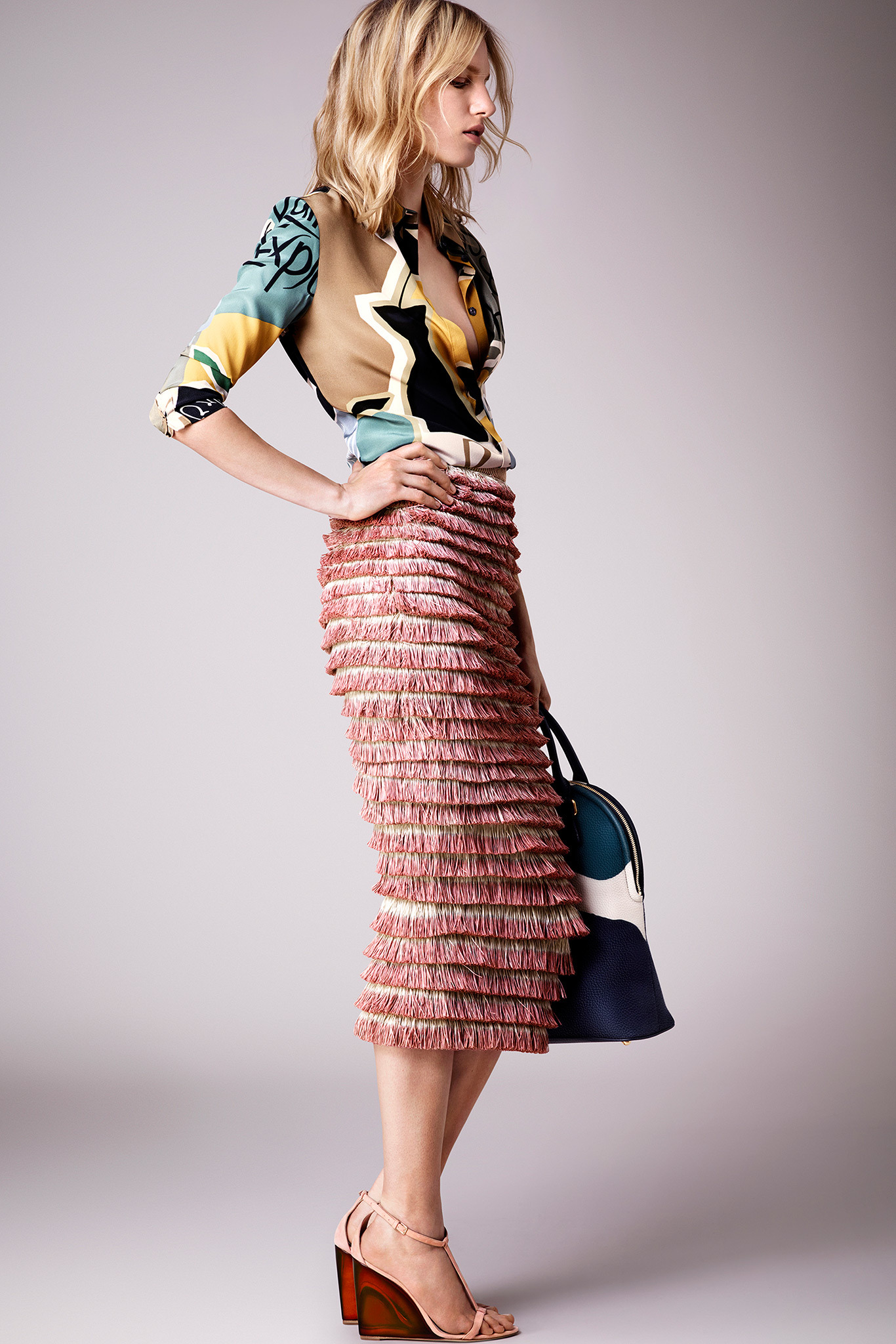 當然細節上的用心不是只有在漸層的染色手法上表現出來,我們也可以看到在風衣,或者是另一個重點單品「鉛筆裙」上,有著許多像是手繪塗鴉感的印花,以及色塊拼接撞色的設計,讓衣服看起來充滿趣味,這些圖案其實也蠻有復古味道的呢!這個靈感是來自於Christopher Bailey在跳蚤市場買到的幾本書。大家有沒有看到,鉛筆裙又出現了,而且和Altuzarra有著類似的搭配方法,就是高腰鉛筆裙配上簡單剪裁的襯衫,然後扣子不要全扣,創造舒服自然卻又有微性感的感覺。