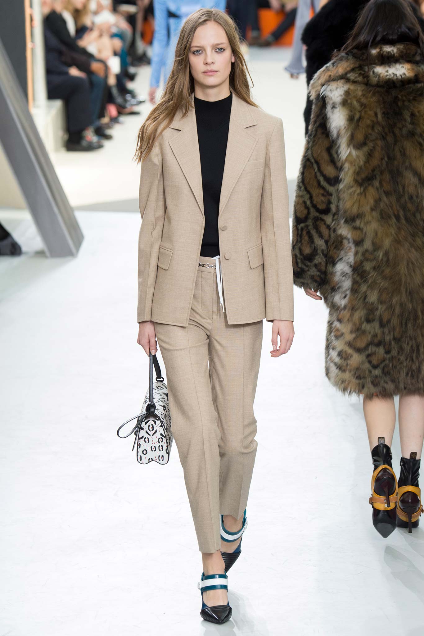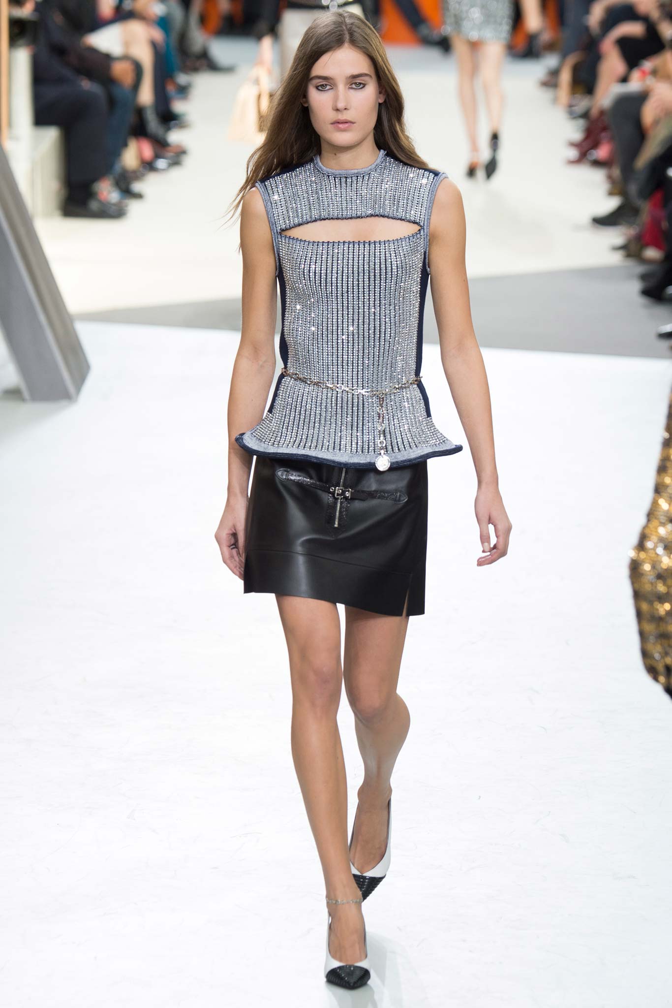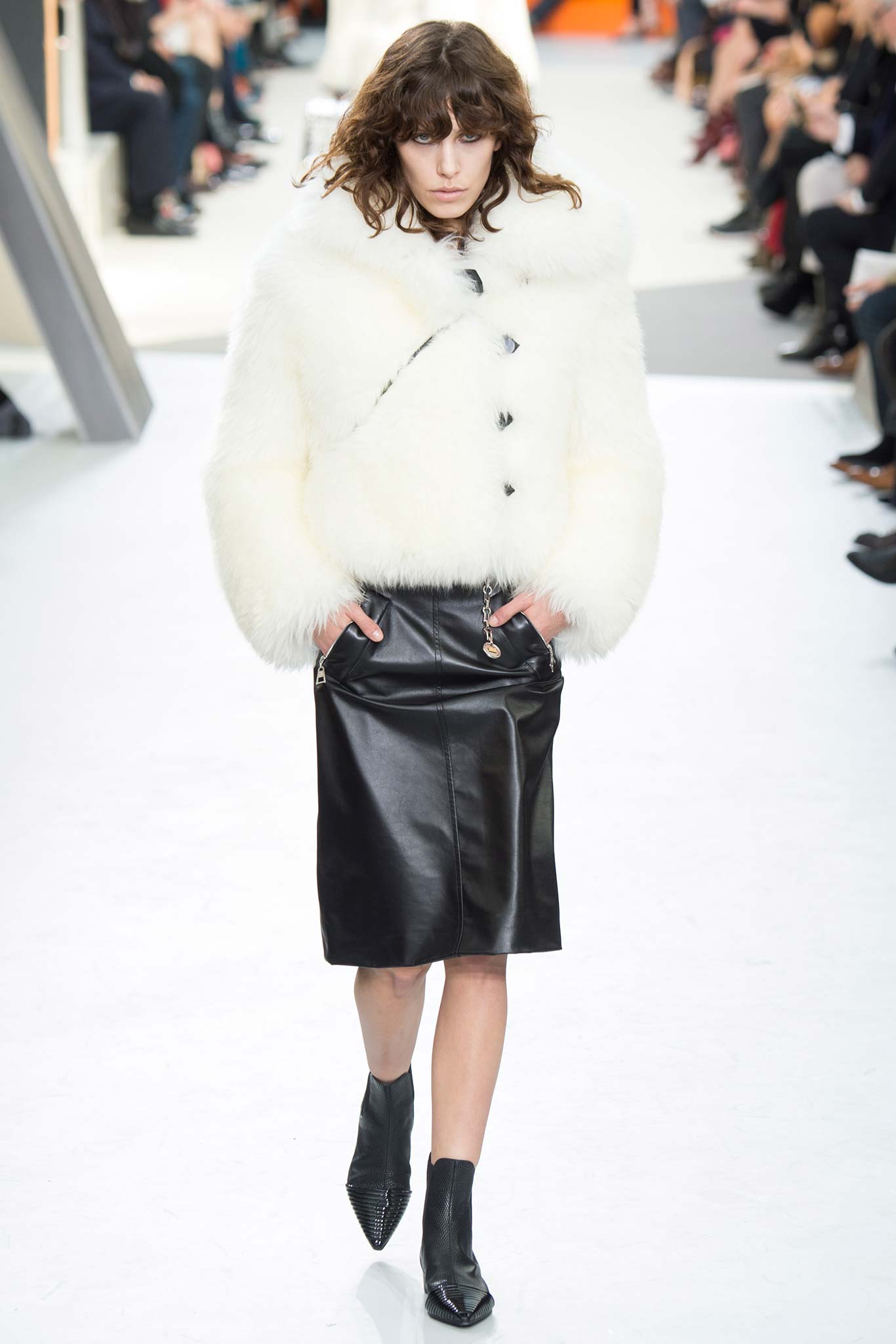 再來就是秀的主角,也就是衣服了。這一季的衣服其實在基本輪廓上和前幾季是連貫的,但是在實穿度以及舒適度上做了更精細的提升。雖說是秋冬,但真的算是厚重的皮草或大衣的比例其實不高,而這些外套和整個系列都能完美的相容在一起,所以搭配還真的是比較重要。我很喜歡他這一次表現在服裝上面的小細節,舉凡裙子上拼接的細皮帶,還是在貼身針織衫上縫上的細密亮片,綿密繁複的刺繡,都說明了他們工藝的高超。然後羊腿袖的設計有點古典味,配上帶有些許未來風的拼貼或是剪裁縫線設計,讓整個系列感覺起來很多層次。