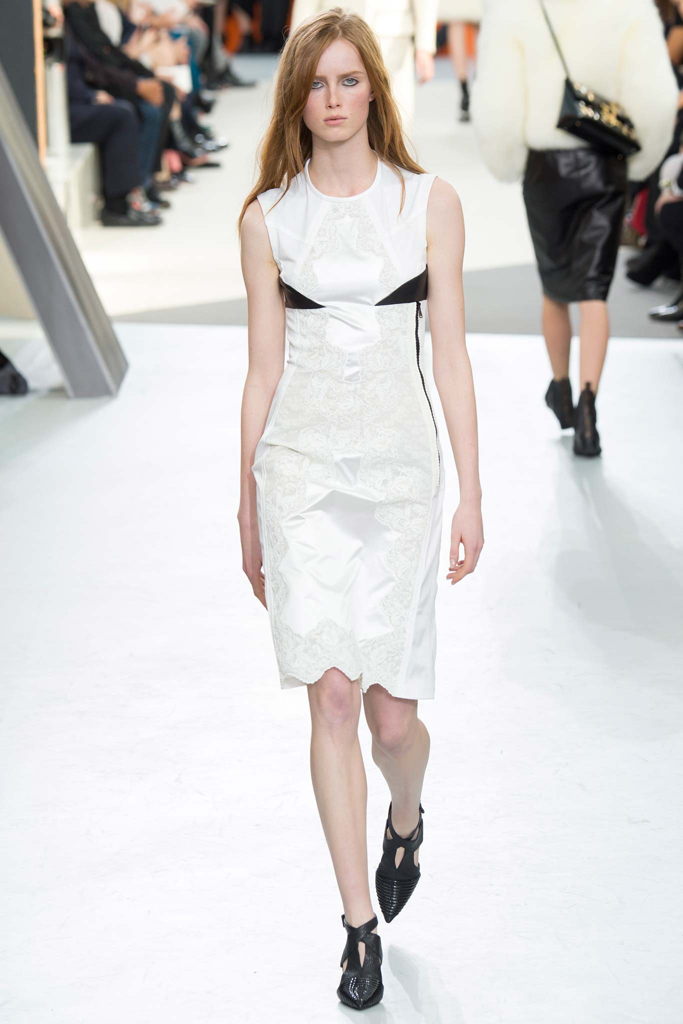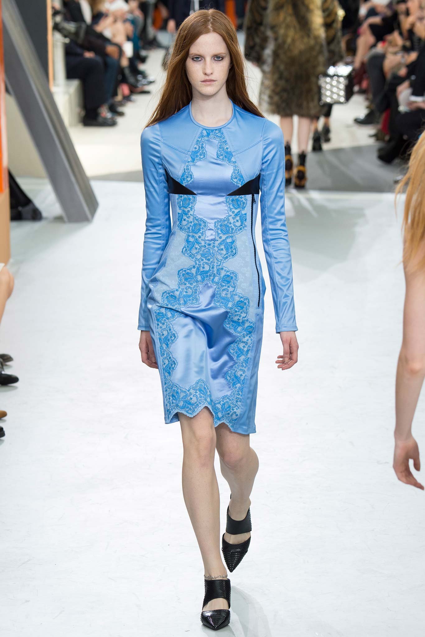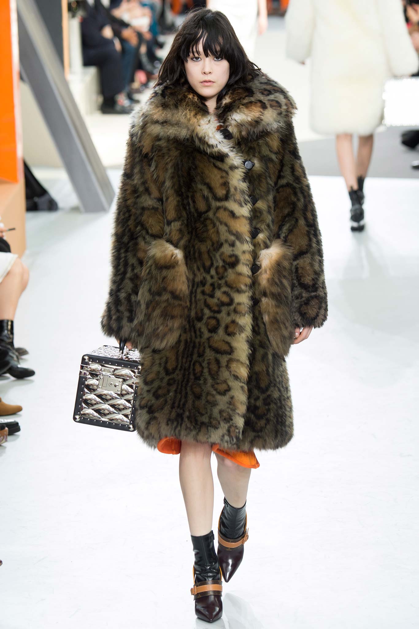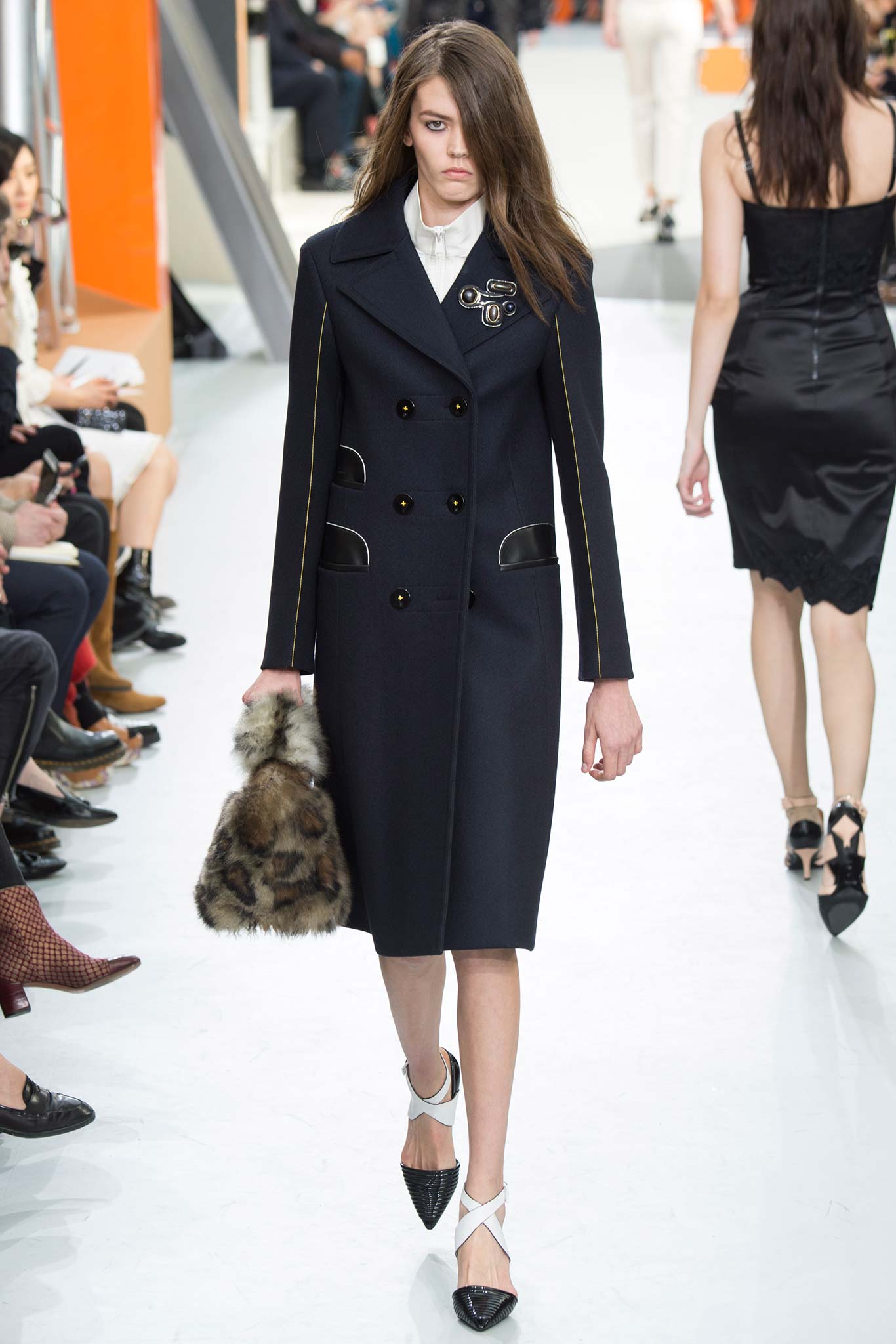 再來就是秀的主角,也就是衣服了。這一季的衣服其實在基本輪廓上和前幾季是連貫的,但是在實穿度以及舒適度上做了更精細的提升。雖說是秋冬,但真的算是厚重的皮草或大衣的比例其實不高,而這些外套和整個系列都能完美的相容在一起,所以搭配還真的是比較重要。我很喜歡他這一次表現在服裝上面的小細節,舉凡裙子上拼接的細皮帶,還是在貼身針織衫上縫上的細密亮片,綿密繁複的刺繡,都說明了他們工藝的高超。然後羊腿袖的設計有點古典味,配上帶有些許未來風的拼貼或是剪裁縫線設計,讓整個系列感覺起來很多層次。
