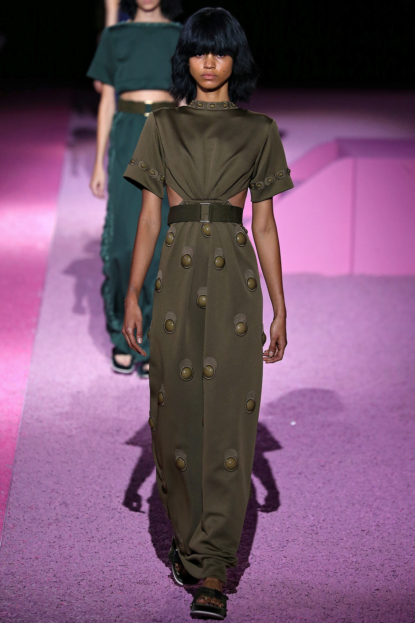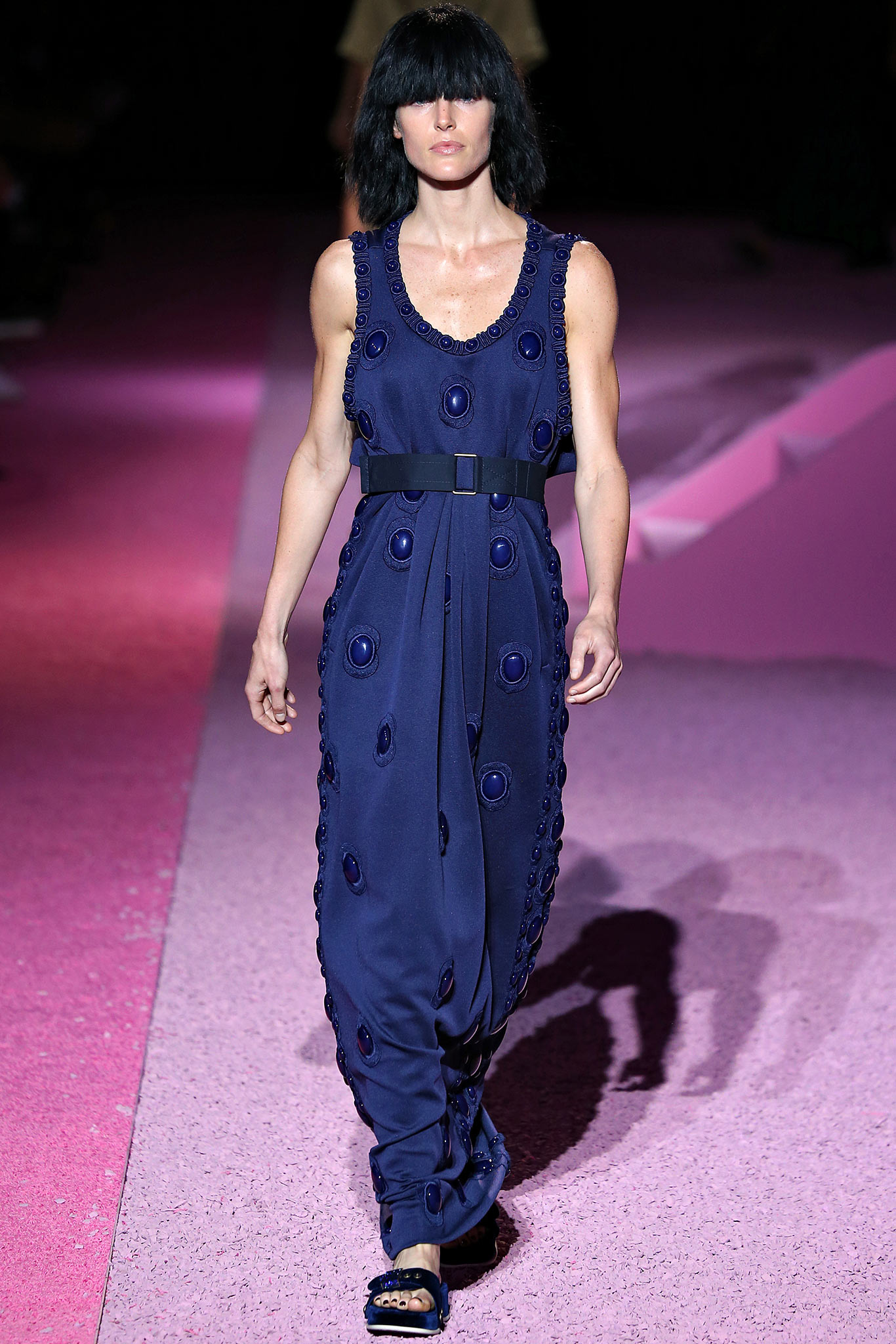 她也是選擇Marc Jacobs的禮服,不過是2015春夏的款式。這一套海軍藍無袖洋裝,有著緞面的腰帶,然後在裙子上有著珠狀的裝飾。在輪廓上的重點應該是腰部的剪裁吧,也是和劉雯那套禮服一樣,身材不夠好的人不能穿這一套。我覺得她的氣質和這套禮服蠻吻合的,只是看起來身材有點直線…裙子也有點像是健康步道一樣(掩面逃走
