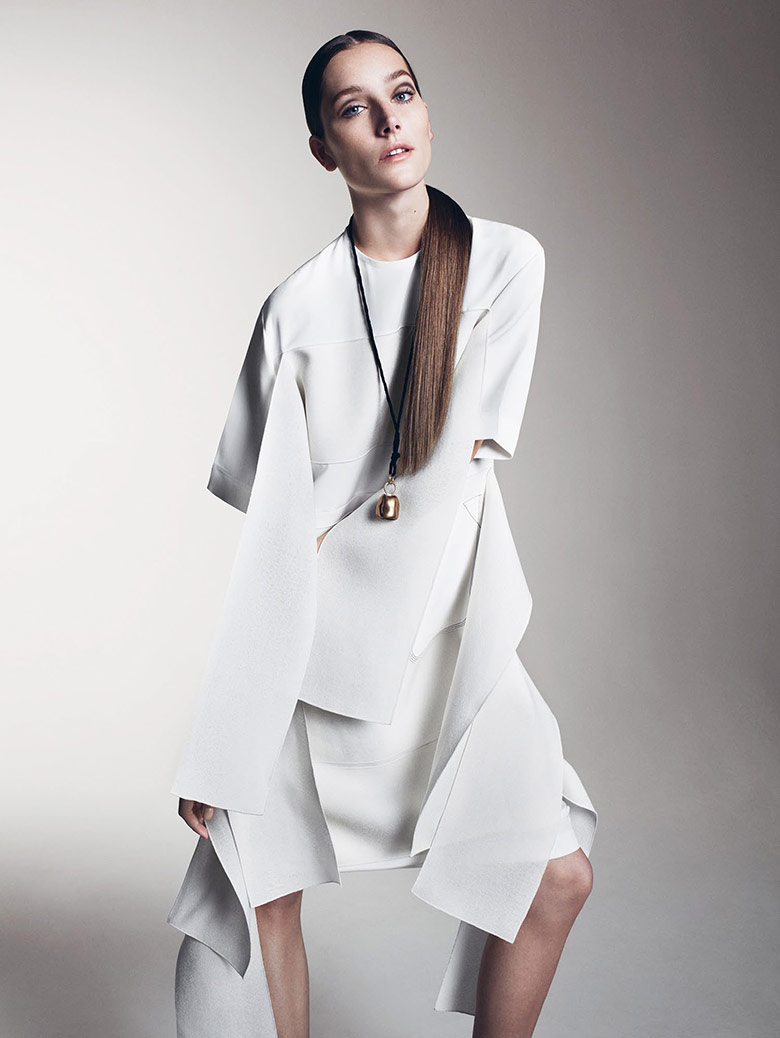 Josephine Le Tutour是法國Elite Model Look的冠軍,在2013春夏時裝周為Calvin Klein走秀時讓全世界記住她的臉孔。我喜歡她與生俱有非常強大的優雅氣質感,恬靜沈穩,又很有智慧。這一期的專題是White in White,這是不好表達的一個主題,拍不好會顯得很平又很無聊,但是有層次的白,加上她的氣質以及Sharif Hamza的鏡頭,讓整個照片很有靈氣。白色,配上金色配飾,真的很絕配。