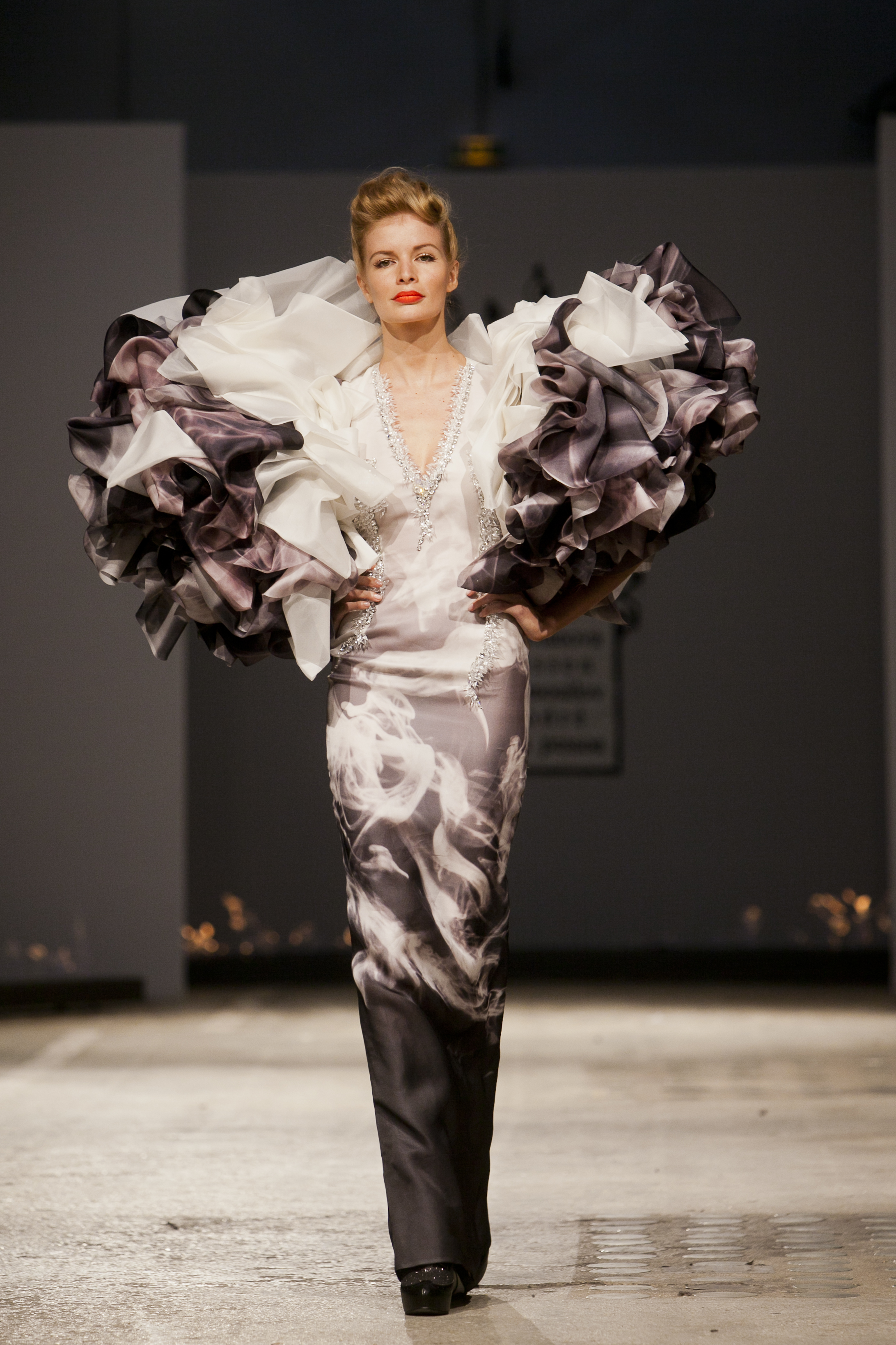 這一套衣服我第一眼看到的時候,我覺得他們是在和Anna Wintour搭配的驚天地泣鬼神的那期VOGUE封面的Christian Lacroix。然後裙子的紋理我蠻喜歡的,像是把大理石穿在身上一樣,而且在結構還有立裁的運用上很精緻,不過可能走路的時候不太好看吧?但是對於她的用心我很喜歡就是。