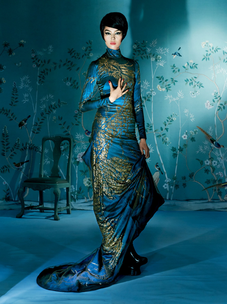 這些照片我覺得還蠻有王家衛風的,色調偏冷調,但不是抑鬱。服裝都挑得非常好,第一套就是紅色旗袍,這是CHANEL 1996年的高級訂製服,再來黃色的龍紋旗袍(大家應該很熟吧?)則是Tom Ford 2004在YSL的作品。第三件旗袍和Nicole Kidman艷驚奧斯卡那件系出同門,是John Galliano於1997的設計。這一系列的照片對我來說,在Styling上面的功力真的很強,非常好看。