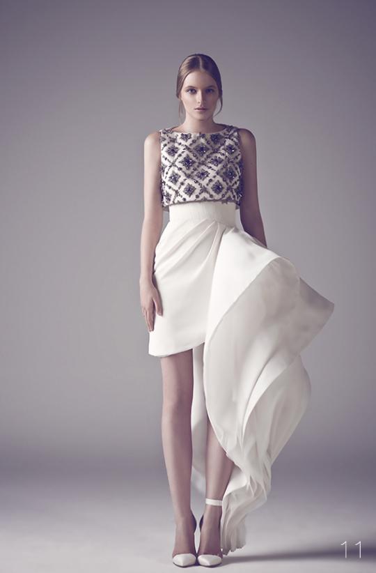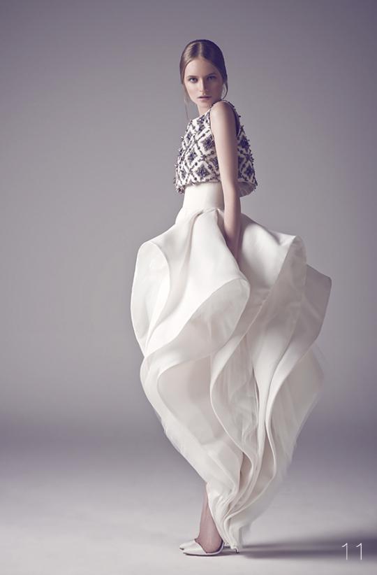 這一件禮服本身真的很好看,有設計感、有氣勢然後細節又細膩到嚇屎人,真的很強。上半身的黑色珠墜拼貼出幾何花紋,吸睛又典雅,加上短裙上的多層次立摺集美,像是盛開的花瓣。雖然在走紅毯的時候裙擺的立體度一定會比拍Lookbook時遜色,但還是非常好看。