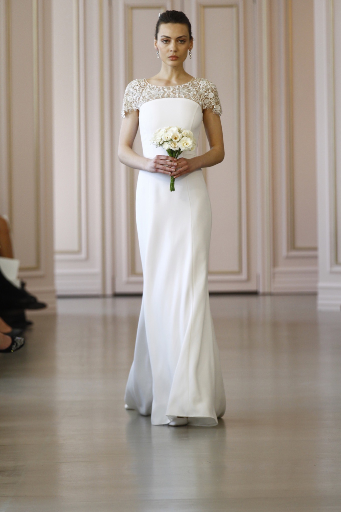 這是Oscar de la Renta欽點接班人Peter Copping的第一季設計,他對於自己捉刀的第一季婚紗設計,抱持著很簡單的想法,就是:「實穿、而且提供足夠典雅有氣質的款式讓各式的新娘可以挑選到她們夢想中的婚紗。」 的確如此,我們在這一季中看到清一色純白的婚紗,這是他對於新娘婚紗的想像。在輪廓上面其實沒有太多太大的創舉或是出乎意料的設計,就是在面料上面以塔夫綢、烏干紗、蕾絲、同色系的水晶及亮片呈現出優雅、高貴、摩登又不老氣的婚紗們。雖然看起來稍嫌保守了點,但絕對是不會出錯的選擇。