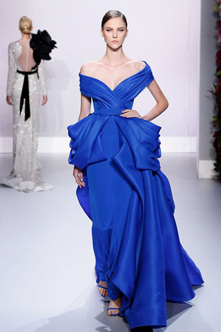 這件選自2014春夏的高級訂製服,保持著一貫立體豐富的剪裁與層次,來勢洶洶沒在客氣。我很喜歡這個寶藍色,很簡單就營造出一股貴氣感。上半身的剪裁也相當好看,裙擺也很好看,唯一就是在腰部那邊多出來的剪裁,感覺少了也不對,多了臀部又變大,有點尷尬。最後,她搭配的Giuseppe Zanotti藍色高跟涼鞋好看又和整身look很搭。