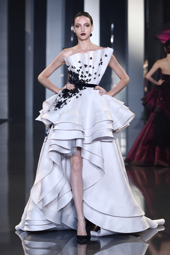 一樣略嫌誇張的輪廓,在層層堆疊的上衣與裙擺層次中,還以像是墨汁潑墨般的印花點綴,就像是皺摺的宣紙上作畫一般。我覺得她詮釋得很好,是帶點drama感的雅緻感。