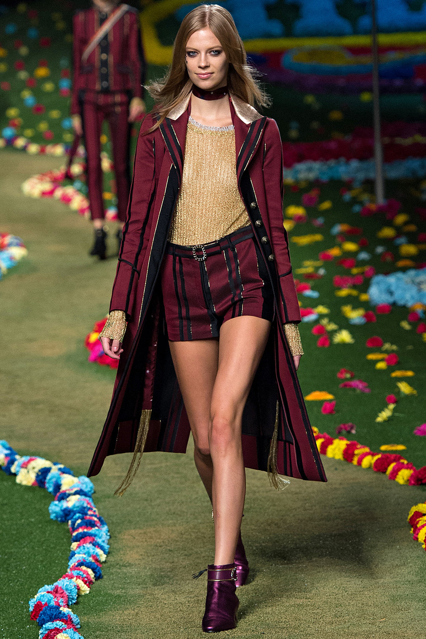 國際章同樣也沒錯過這國際規格的大秀,她也精心打扮,第一套是以一件白襯衫配上單排扣水手服感的短裙,十足度假休閒風。秀後,則是以2015春夏的學院風短褲和大家見面,這兩套真的都相當年輕、相當俏麗,我喜歡她的妝髮,很青春,腳上的鞋子我也蠻喜歡的,和唇色呼應,又同屬女孩風。