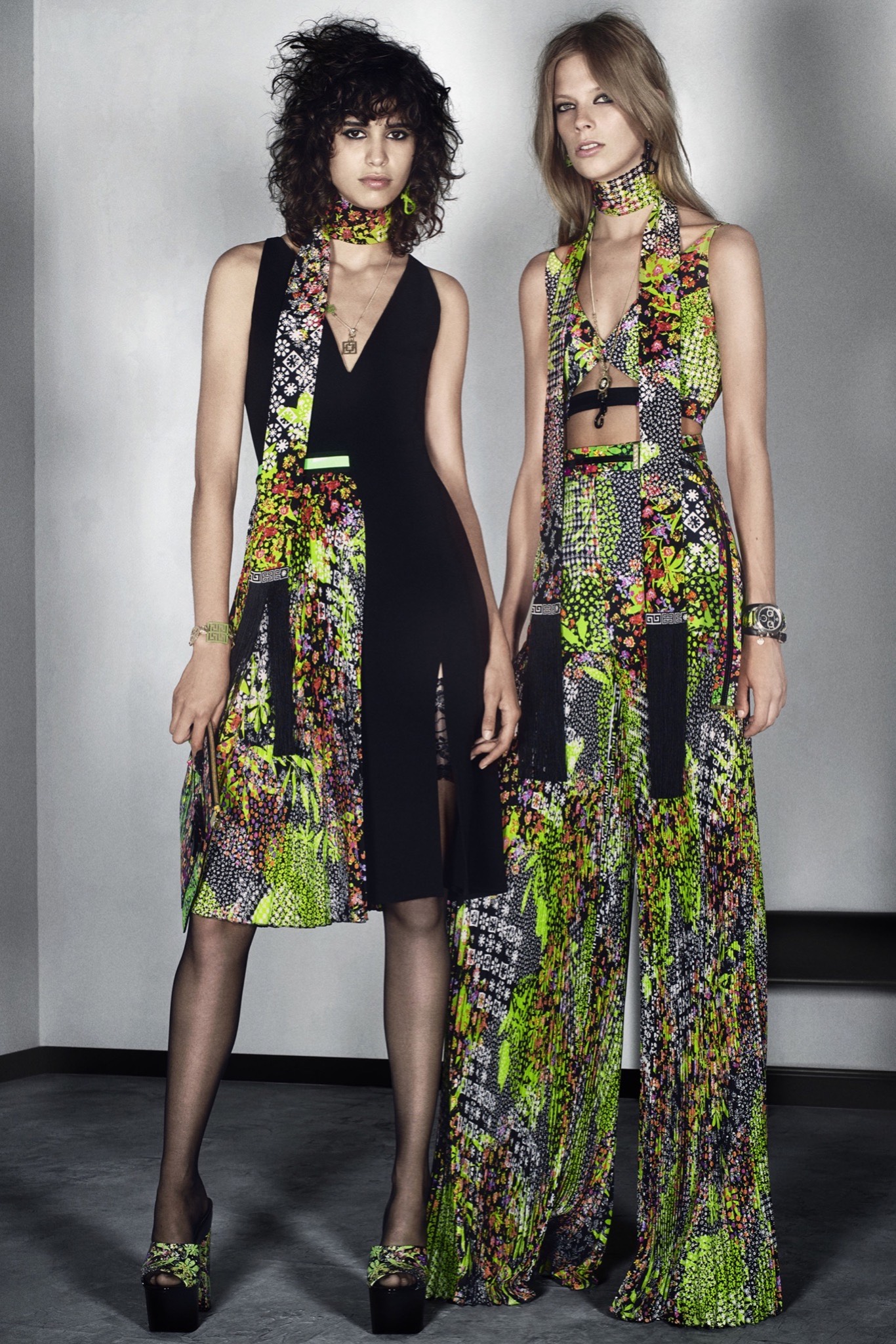 之所以說一念天堂,是這些螢光顏色,運用得巧妙(像是放在褲裝或外套的兩側)看起來很潮很chic,但是如果太大量的使用就低俗的很像在地獄。這次的Versace,除了幾套已經很好看的褲裝或是顏色搭配得宜的洋裝之外,其他單品都相當考驗穿衣者的搭配功力,不得不慎。