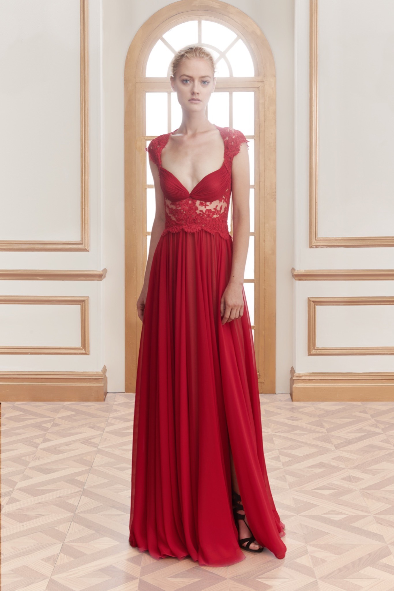 早春的Reem Acra我們看到了明確的實穿主義與市場取向,雖然這麼說,但是在美感上卻一點也沒有偏廢。在顏色上的運用是最讓我著迷的地方,紅色與粉紅色的相間、寶藍色的短洋裝(看看那個荷葉邊多麼立體),裸膚色的禮服(裙擺處理得宛如沙丘上的波紋一般),當然他們家招牌的蕾絲也沒缺席,巧妙地點綴在各式面料和輪廓上,適當增加了不少氣質!