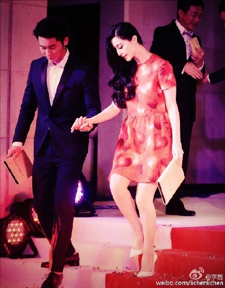 (接下來要扮演木瓜霞口吻)剛卸任武則天馬上又要扮演楊玉環的范冰冰,在出席活動的時候,身穿Valentino 2015早秋一身愛心印花的洋裝,和身旁的李晨相互輝映的光芒簡直讓我要牽可魯。不過可能是因為厚底穿太久,換回一般的Christian Louboutin高跟鞋不太適應,就跌了個踉蹌囉。