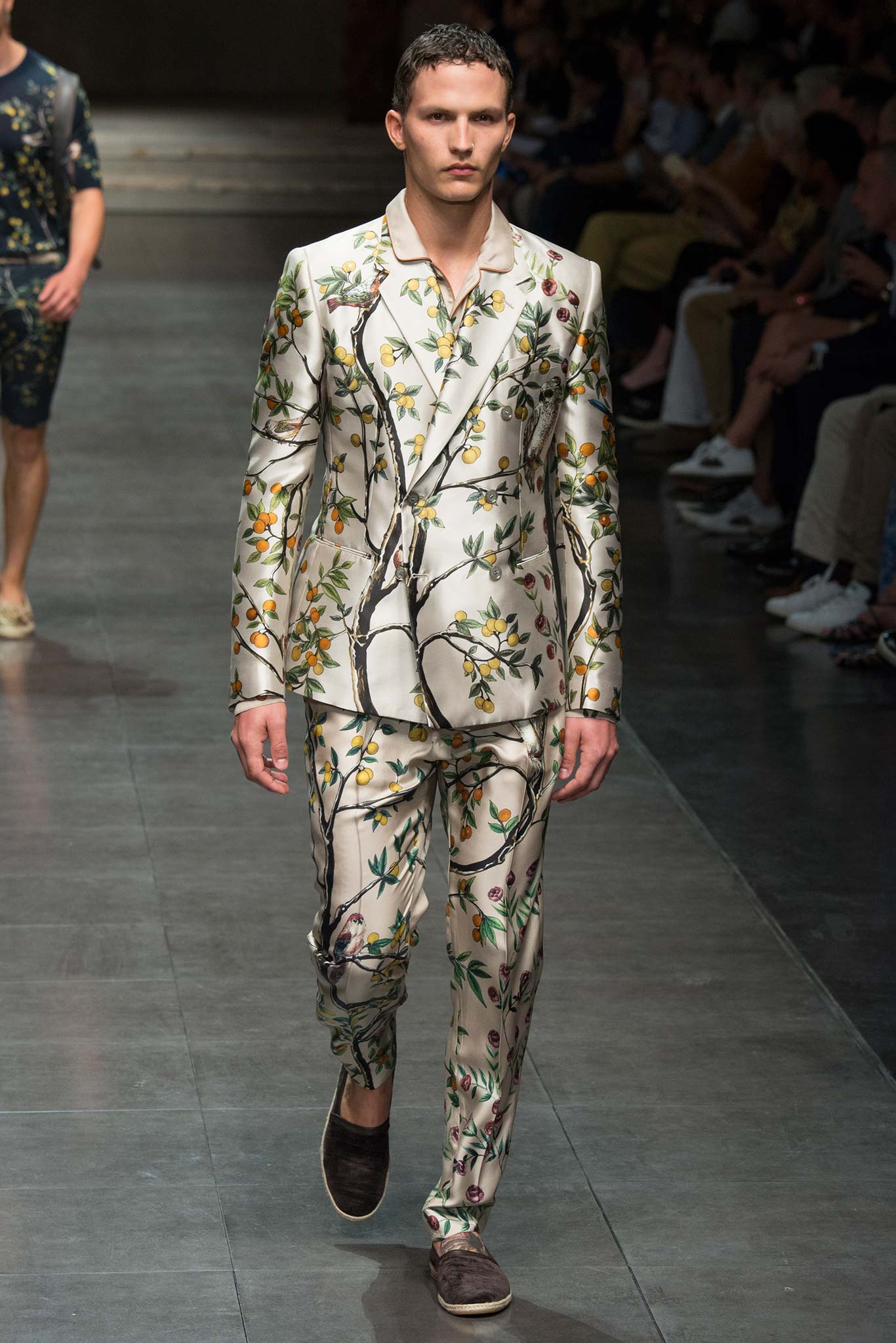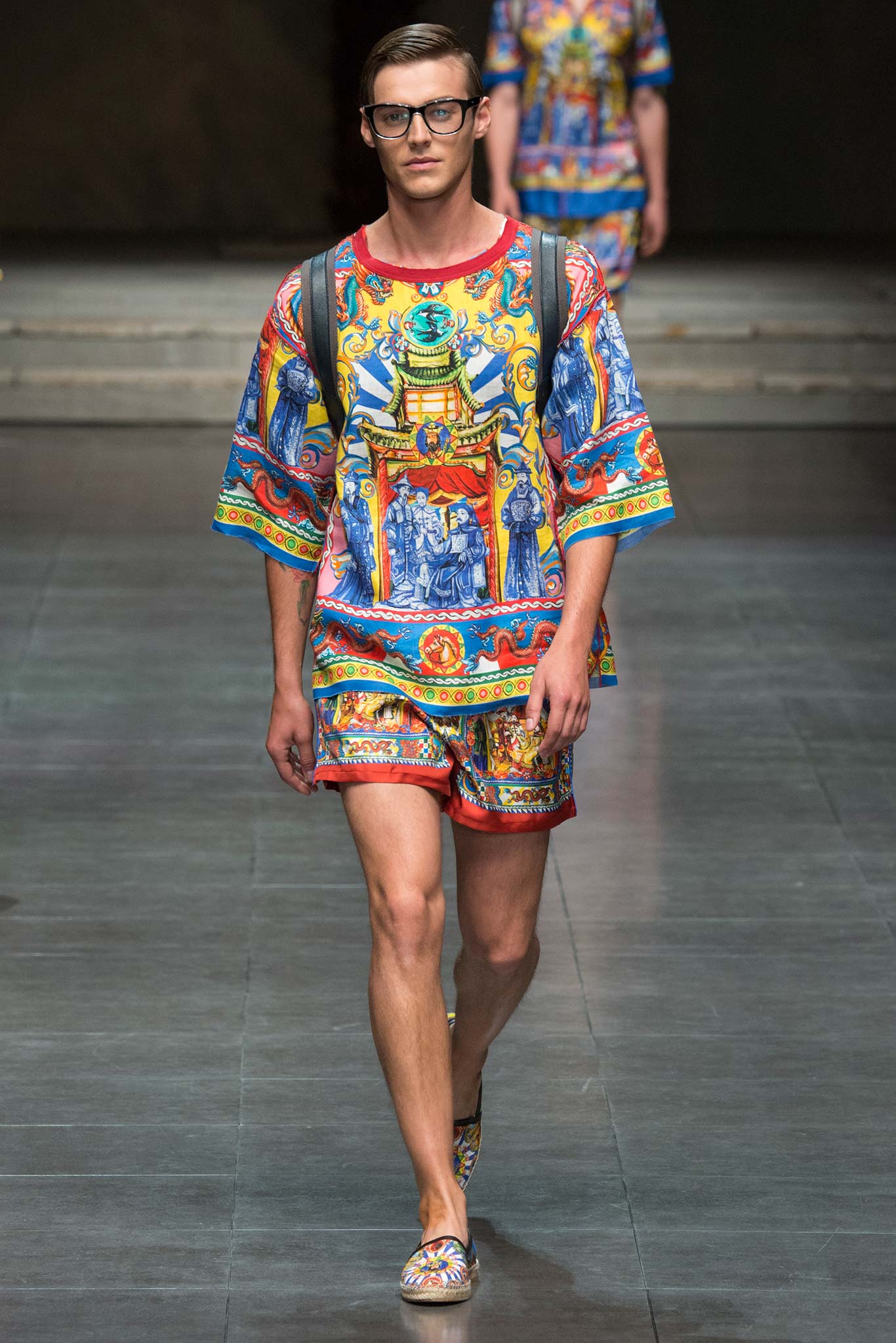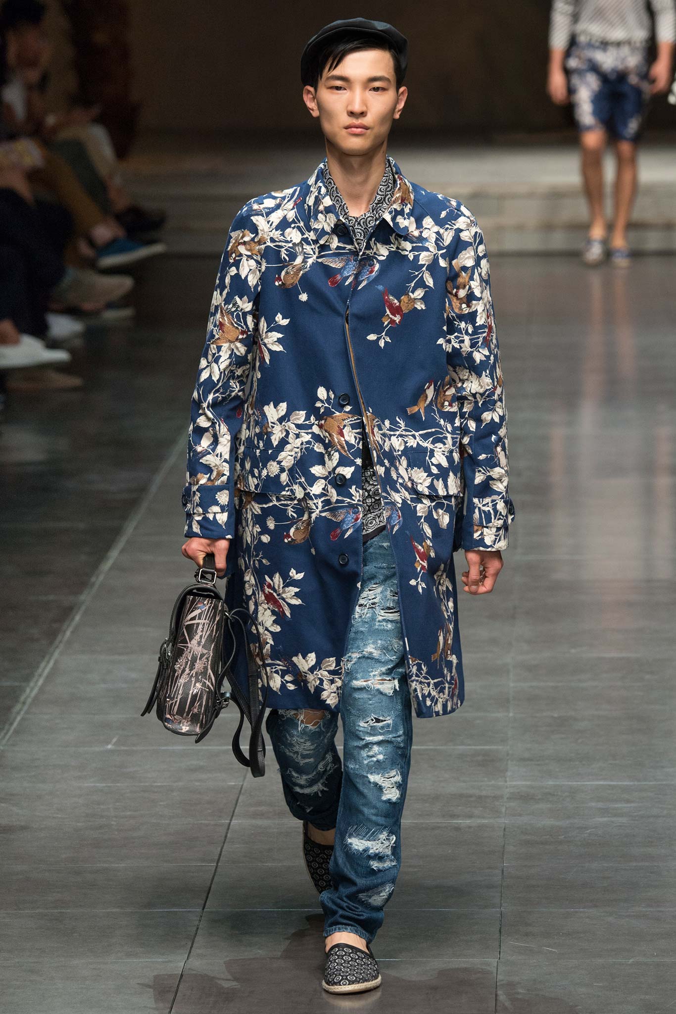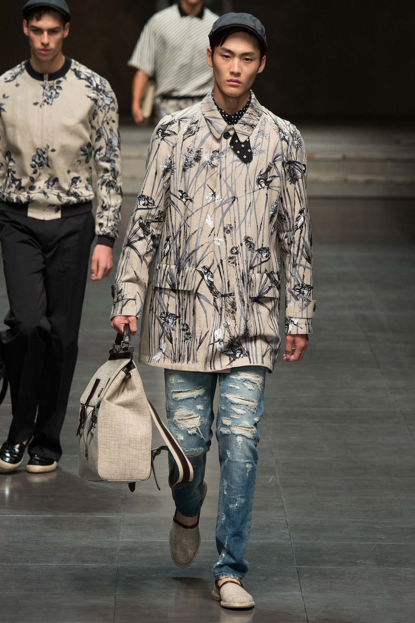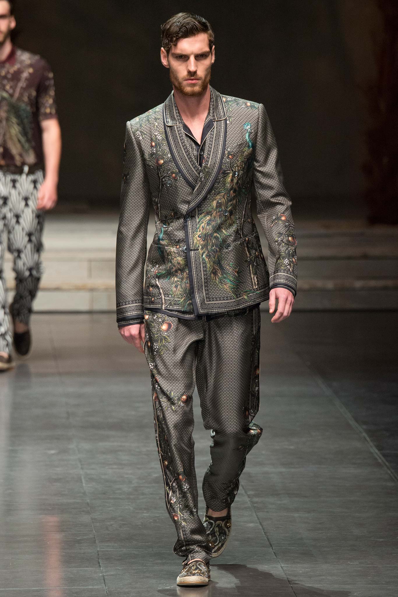 接下來,我們可以看到Dolce&Gabbana把西方輪廓的剪裁當作畫布,在上面出現許多東方的工筆花鳥畫、人物輪廓畫、建築畫通通都是重點。除此之外,我們也能看到許多以清朝服裝結構為本的衣服(像是肩線的輪廓)都能看出他們的用心。其中一件上身像是麻布袋面料的上衣,繡有聖母像;但是褲子上的印花卻是中國的皇帝,這樣的幽默我還挺喜歡的。當然,品牌最後幾套有點走火入魔的彩色印花西裝看來詭異,但認真看裡面的印花,可是有龍、皇帝、傳教士、神父這些混搭呢!