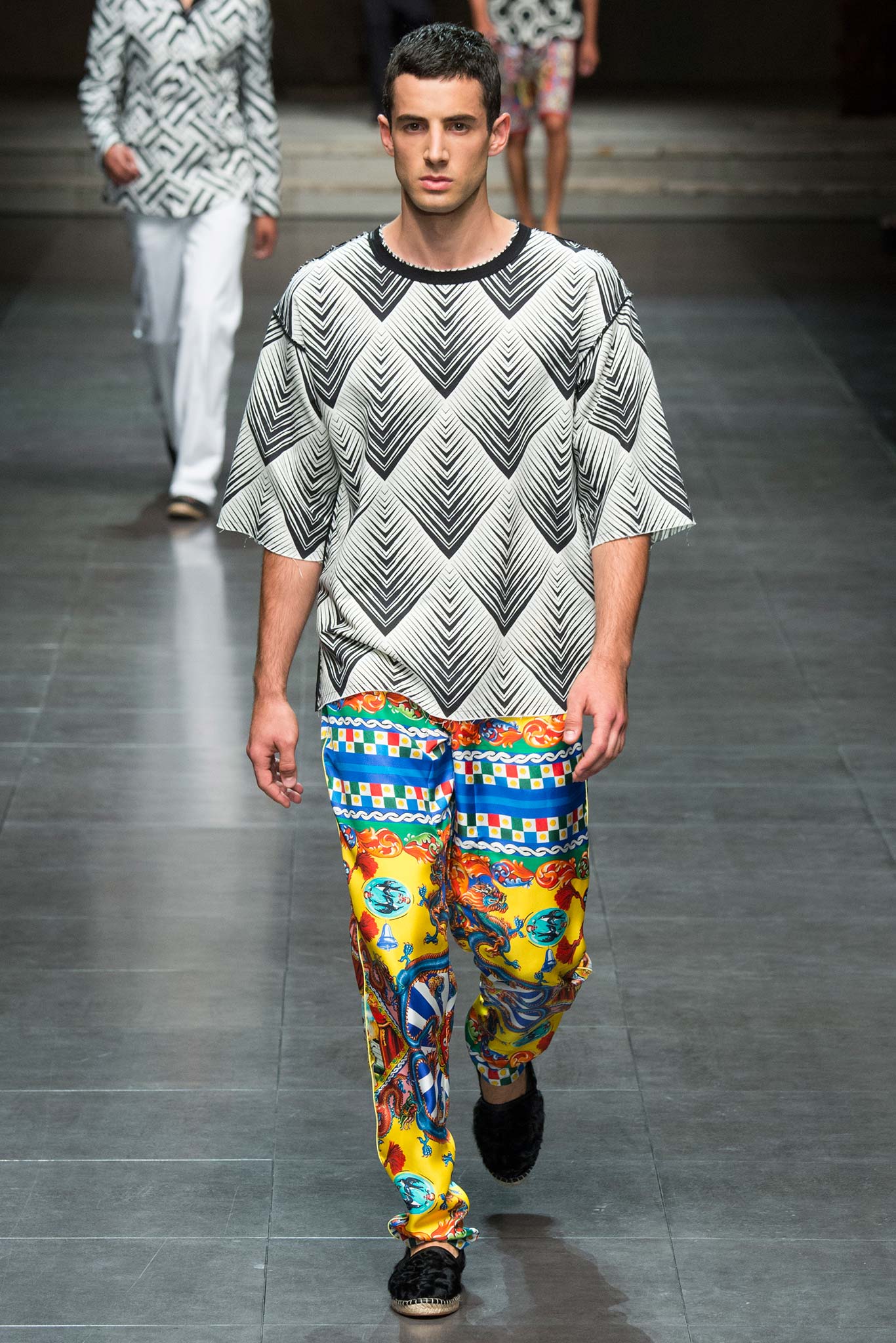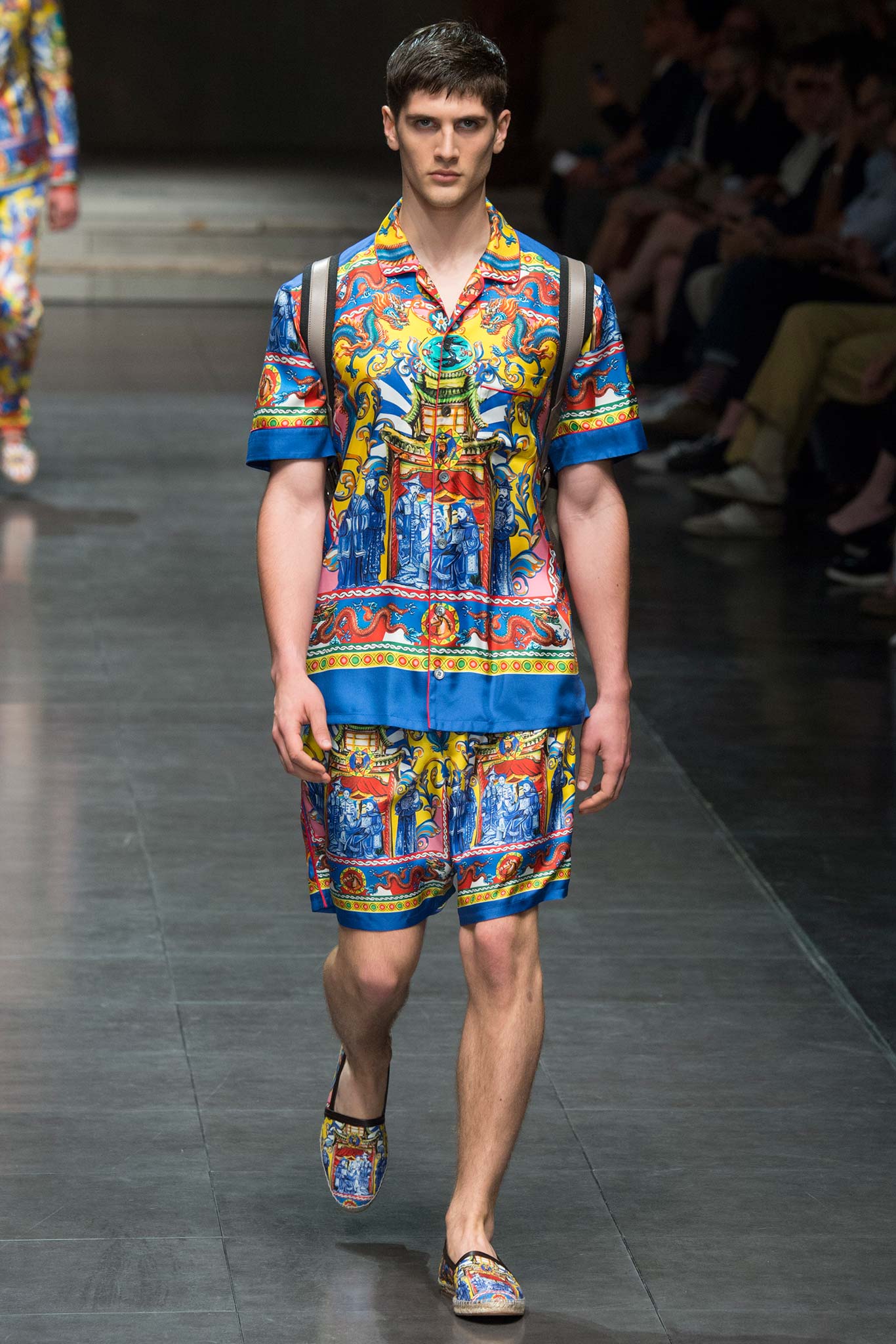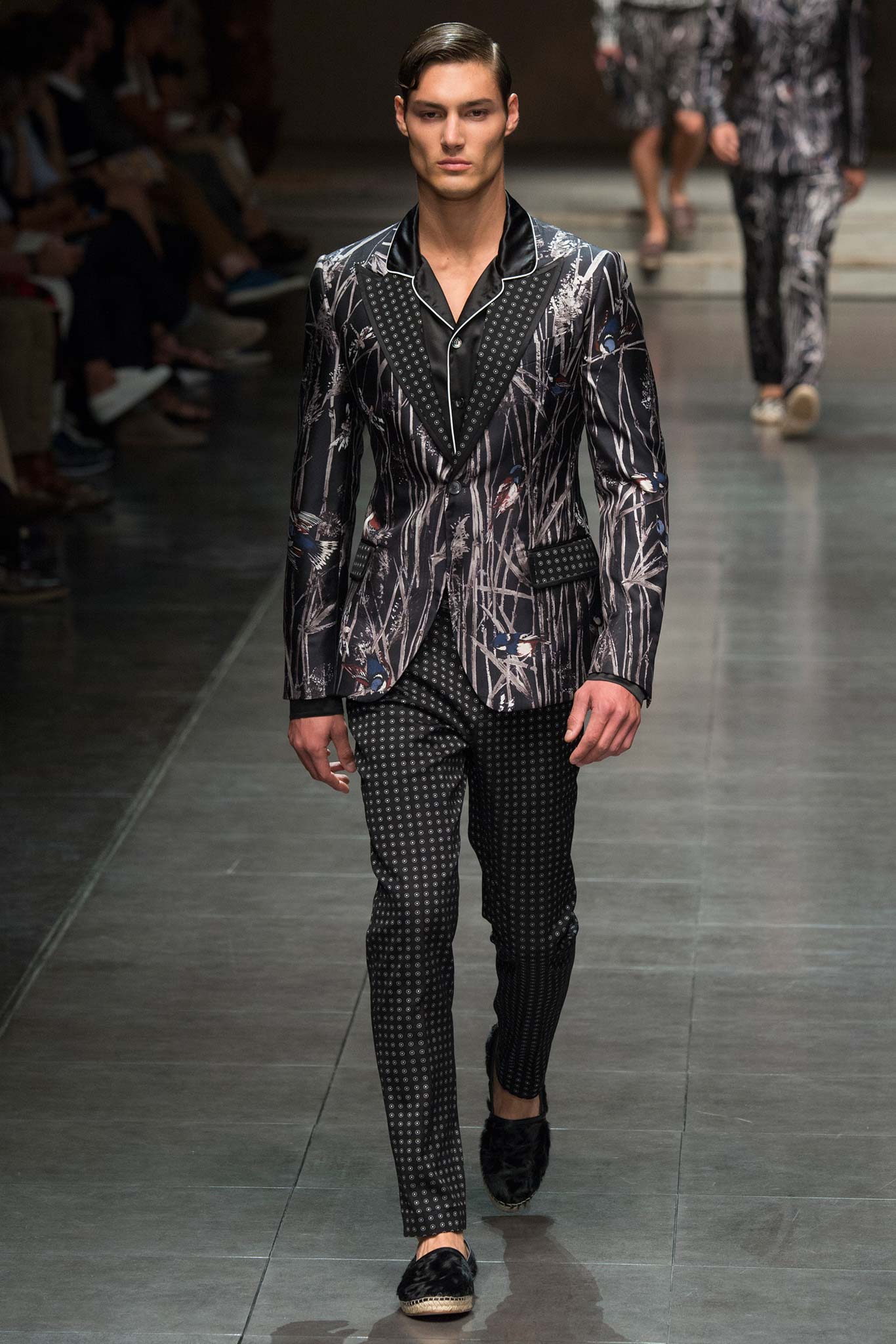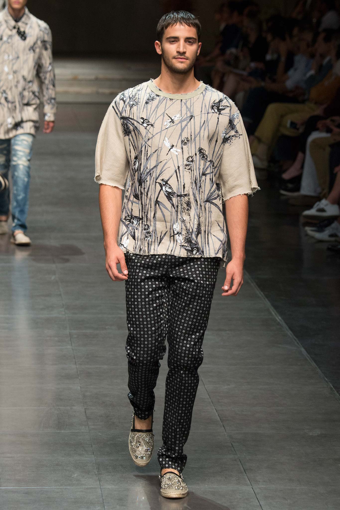 接下來,我們可以看到Dolce&Gabbana把西方輪廓的剪裁當作畫布,在上面出現許多東方的工筆花鳥畫、人物輪廓畫、建築畫通通都是重點。除此之外,我們也能看到許多以清朝服裝結構為本的衣服(像是肩線的輪廓)都能看出他們的用心。其中一件上身像是麻布袋面料的上衣,繡有聖母像;但是褲子上的印花卻是中國的皇帝,這樣的幽默我還挺喜歡的。當然,品牌最後幾套有點走火入魔的彩色印花西裝看來詭異,但認真看裡面的印花,可是有龍、皇帝、傳教士、神父這些混搭呢!